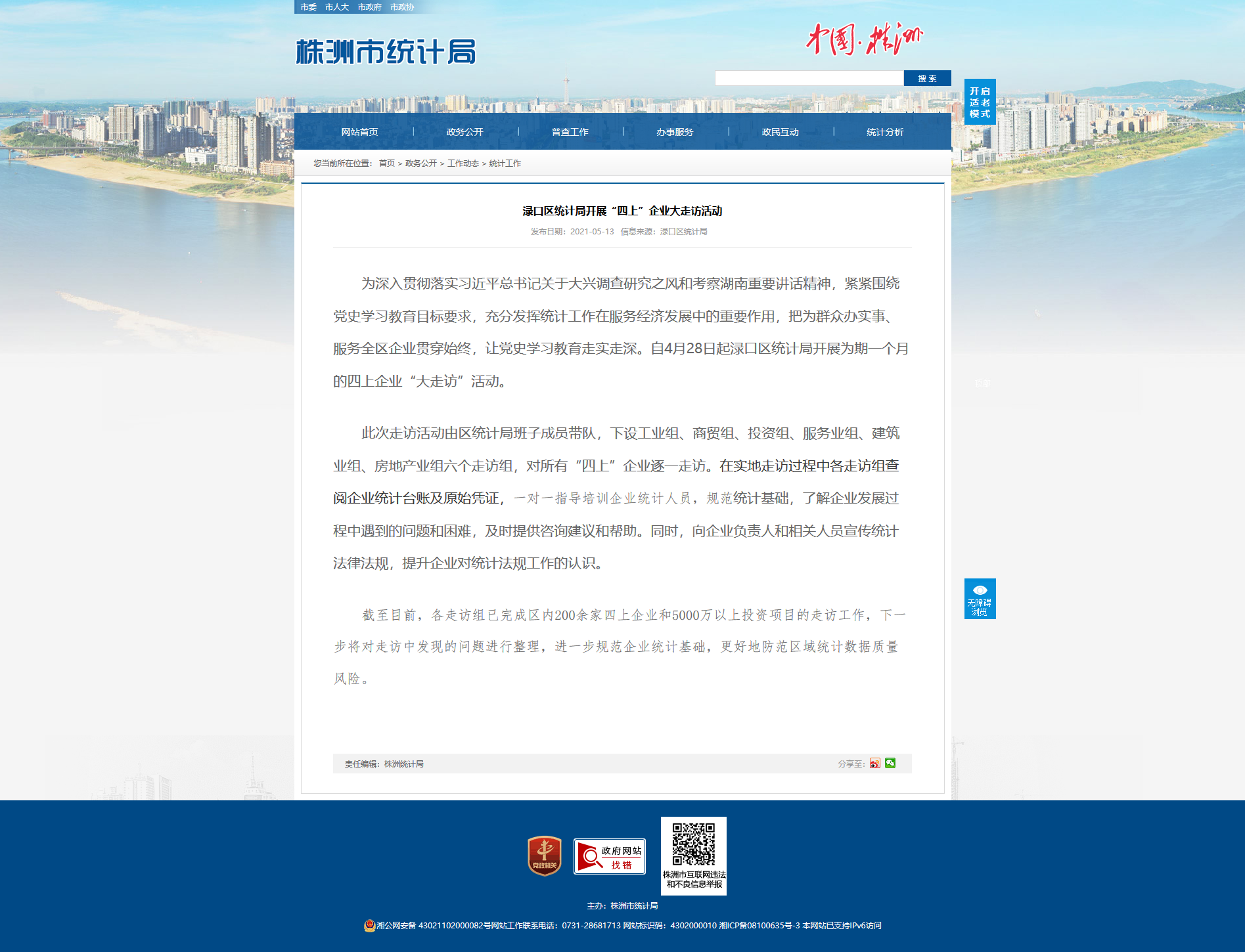 为深入贯彻落实习近平总书记关于大兴调查研究之风和考察湖南重要讲话精神,紧紧围绕党史学习教育目标要求,充分发挥统计工作在服务经济发展中的重要作用,把为群众办实事、服务全区企业贯穿始终,让党史学习教育走实走深。自4月28日起渌口区统计局开展为期一个月的四上企业“大走访”活动。