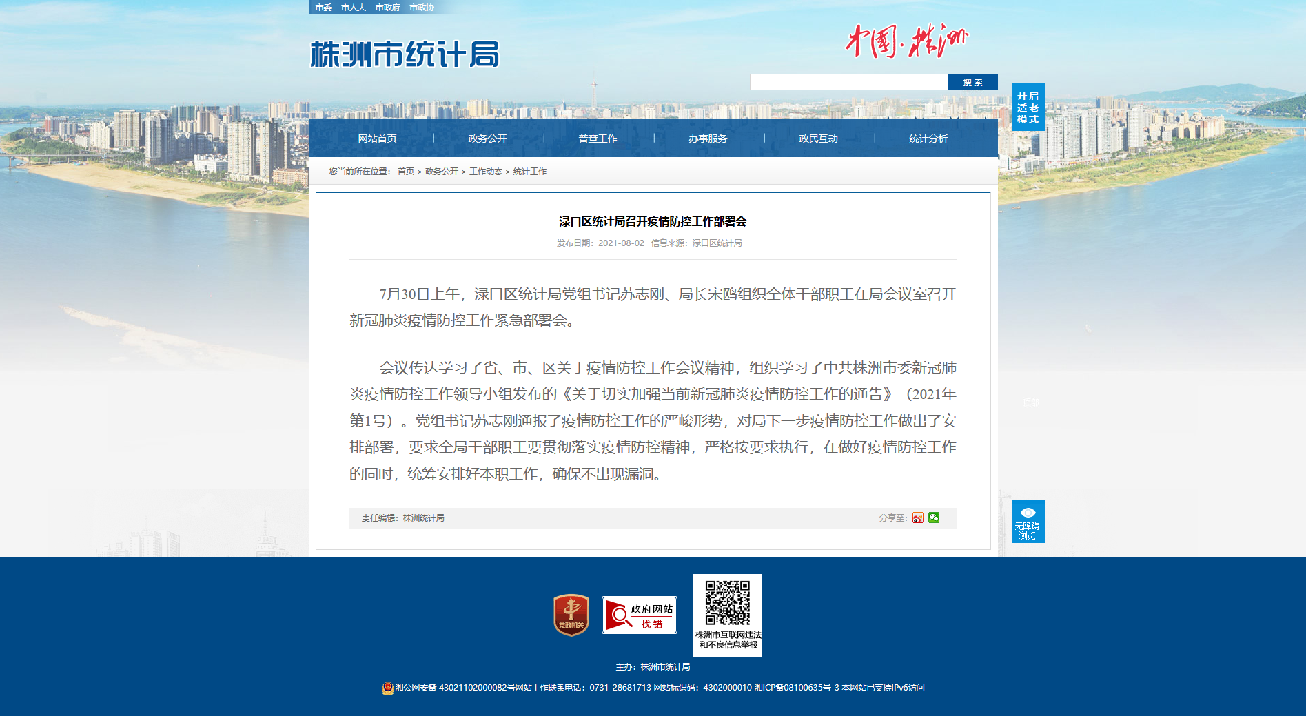 7月30日上午,渌口区统计局党组书记苏志刚、局长宋鸥组织全体干部职工在局会议室召开新冠肺炎疫情防控工作紧急部署会。