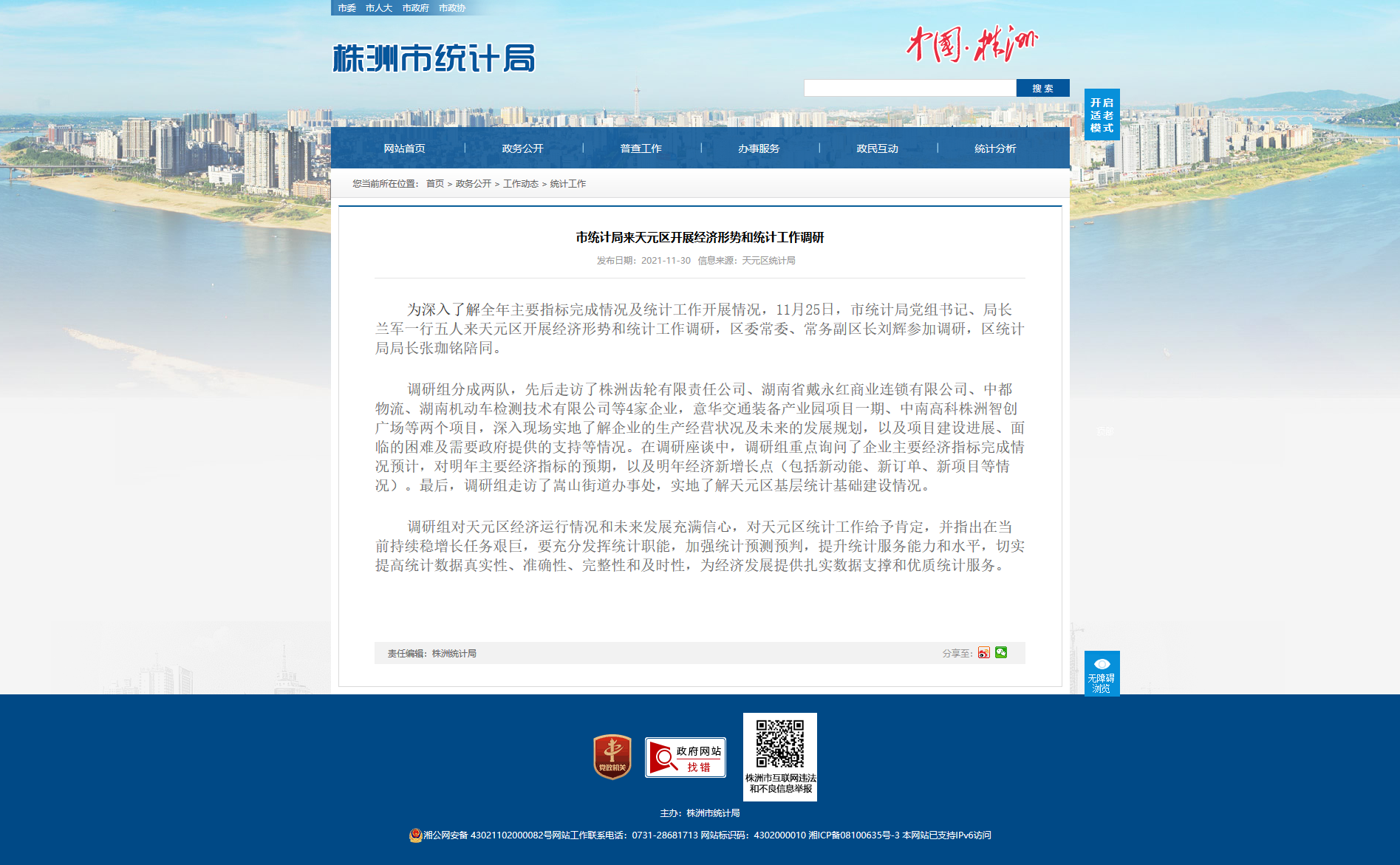调研组对天元区经济运行情况和未来发展充满信心,对天元区统计工作给予肯定,并指出在当前持续稳增长任务艰巨,要充分发挥统计职能,加强统计预测预判,提升统计服务能力和水平,切实提高统计数据真实性、准确性、完整性和及时性,为经济发展提供扎实数据支撑和优质统计服务。