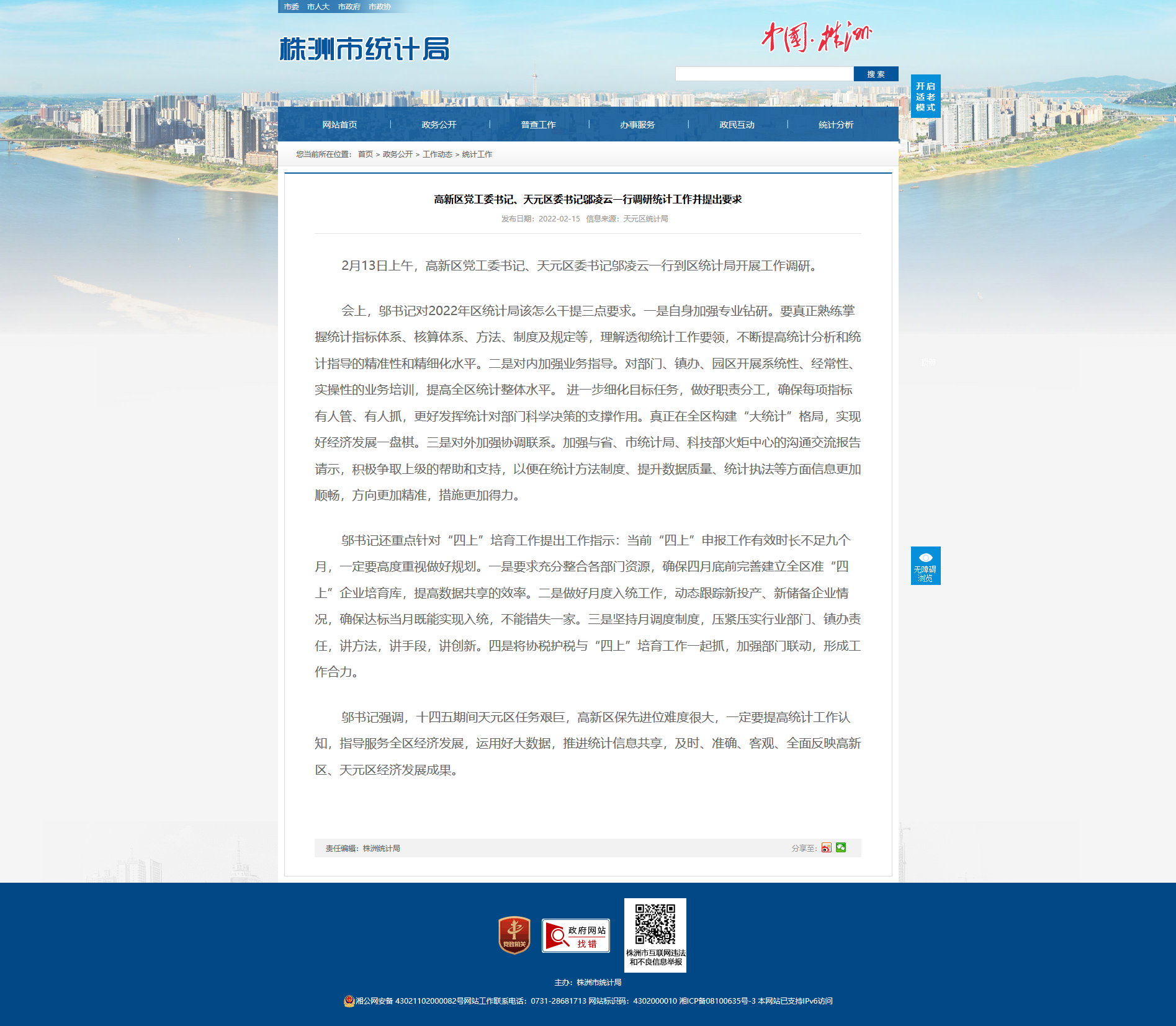 2月13日上午,高新区党工委书记、天元区委书记邬凌云一行到区统计局开展工作调研。