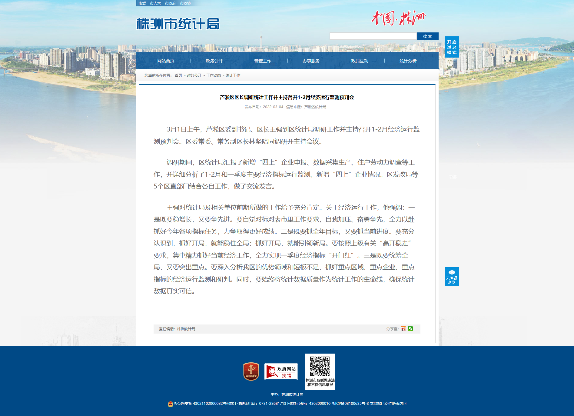 3月1日上午,芦淞区委副书记、区长王强到区统计局调研工作并主持召开1-2月经济运行监测预判会。区委常委、常务副区长林坚陪同调研并主持会议。