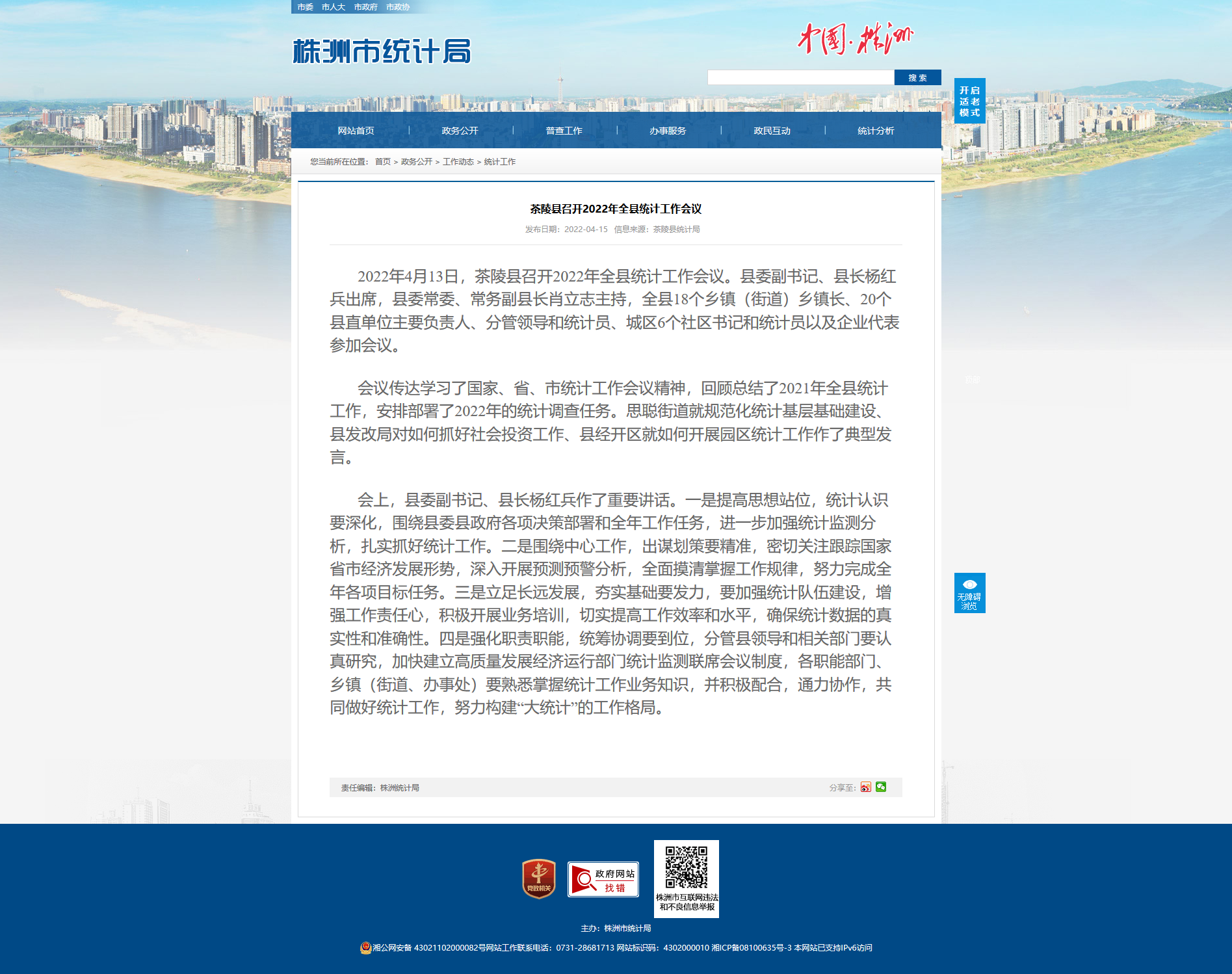 2022年4月13日,茶陵县召开2022年全县统计工作会议。县委副书记、县长杨红兵出席,县委常委、常务副县长肖立志主持,全县18个乡镇(街道)乡镇长、20个县直单位主要负责人、分管领导和统计员、城区6个社区书记和统计员以及企业代表参加会议。