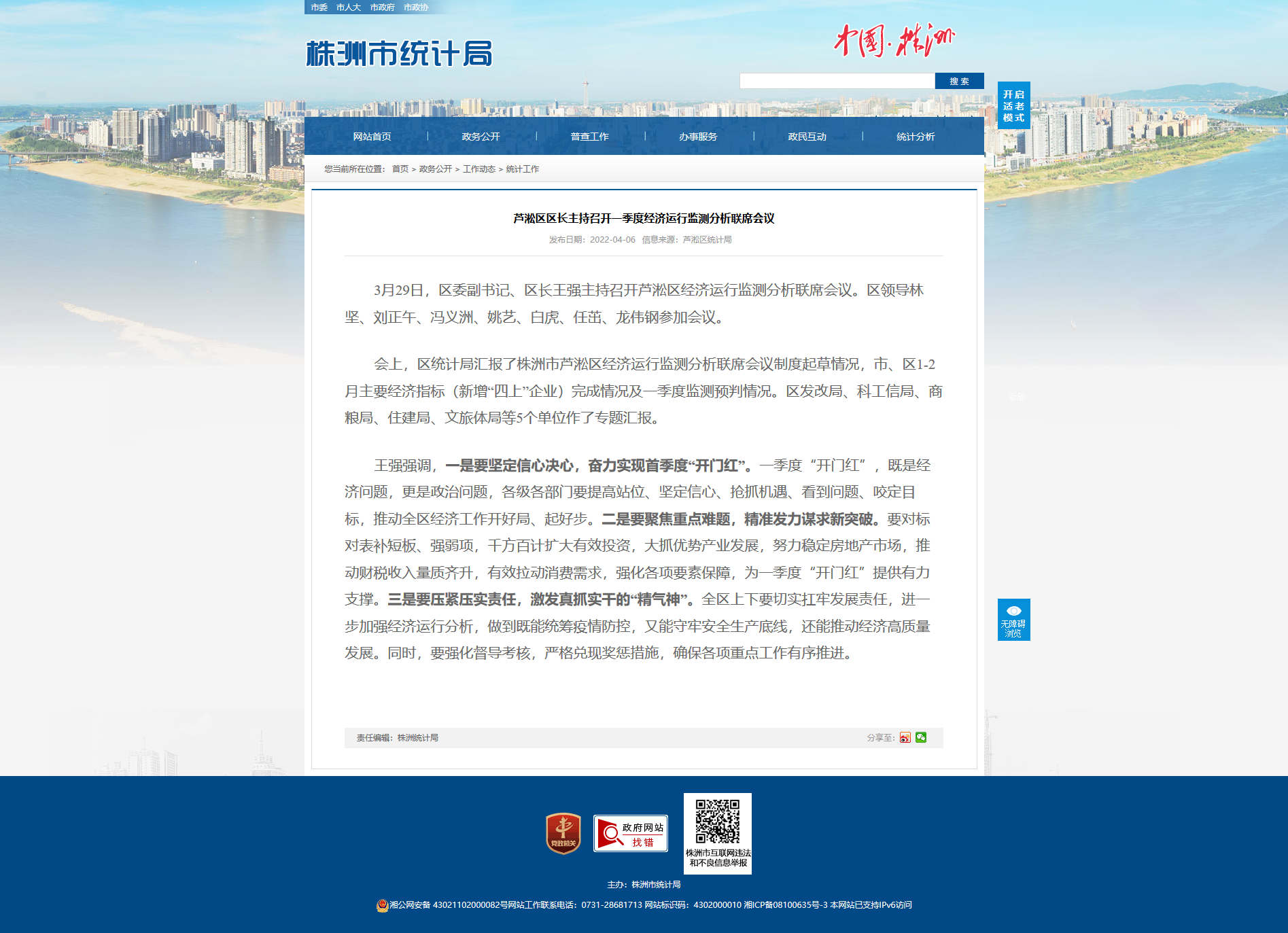 会上,区统计局汇报了株洲市芦淞区经济运行监测分析联席会议制度起草情况,市、区1-2月主要经济指标(新增“四上”企业)完成情况及一季度监测预判情况。区发改局、科工信局、商粮局、住建局、文旅体局等5个单位作了专题汇报。