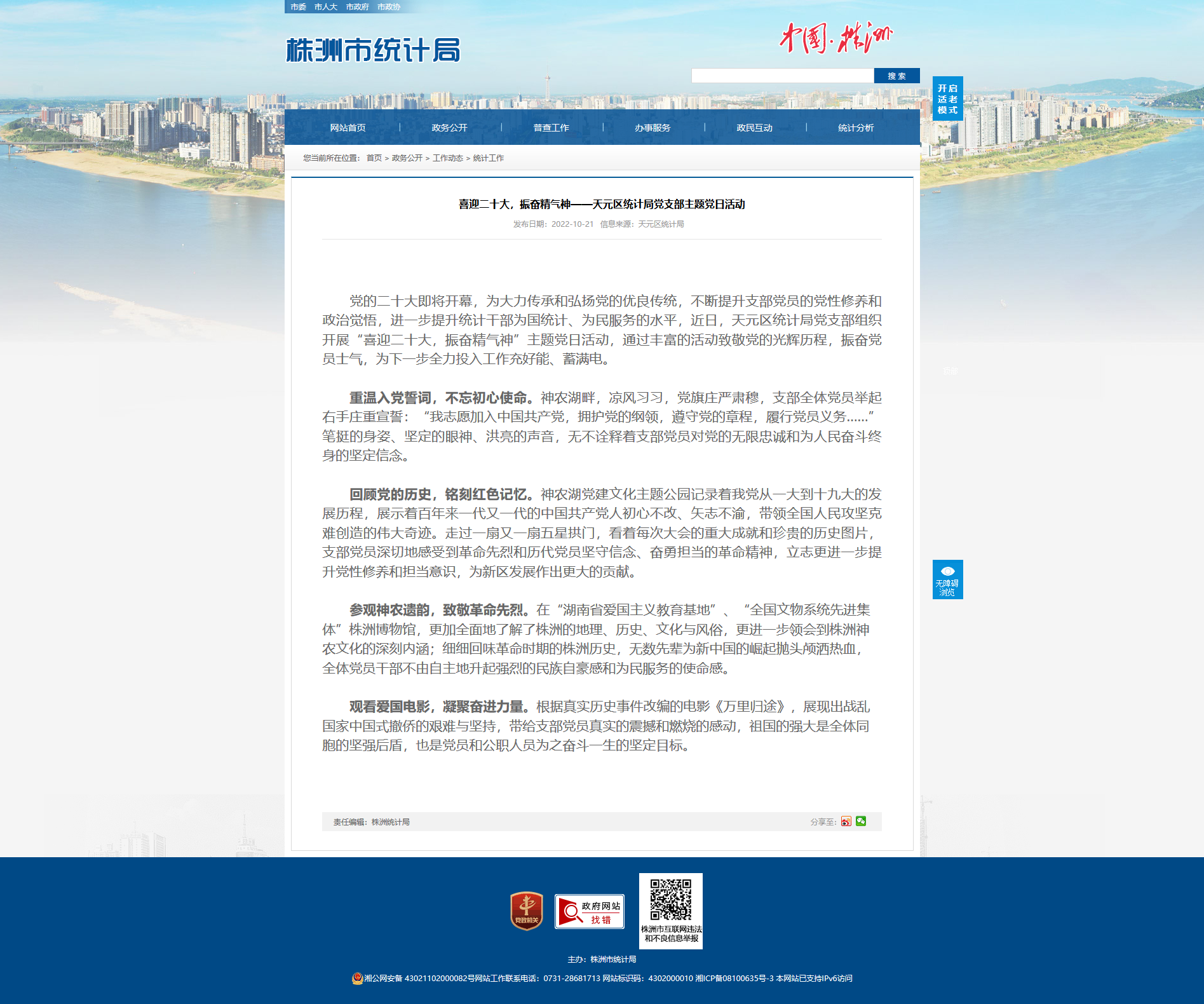 党的二十大即将开幕,为大力传承和弘扬党的优良传统,不断提升支部党员的党性修养和政治觉悟,进一步提升统计干部为国统计、为民服务的水平,近日,天元区统计局党支部组织开展“喜迎二十大,振奋精气神”主题党日活动,通过丰富的活动致敬党的光辉历程,振奋党员士气,为下一步全力投入工作充好能、蓄满电。