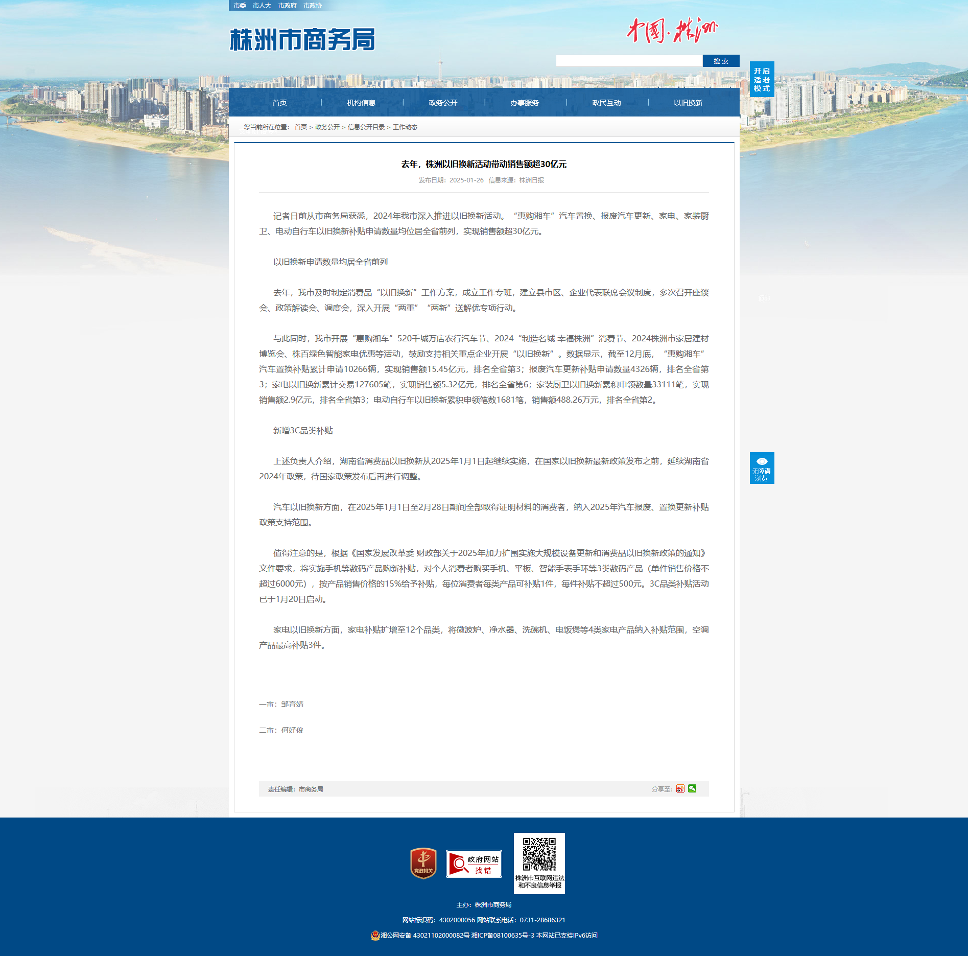 记者日前从市商务局获悉,2024年我市深入推进以旧换新活动。“惠购湘车”汽车置换、报废汽车更新、家电、家装厨卫、电动自行车以旧换新补贴申请数量均位居全省前列,实现销售额超30亿元。