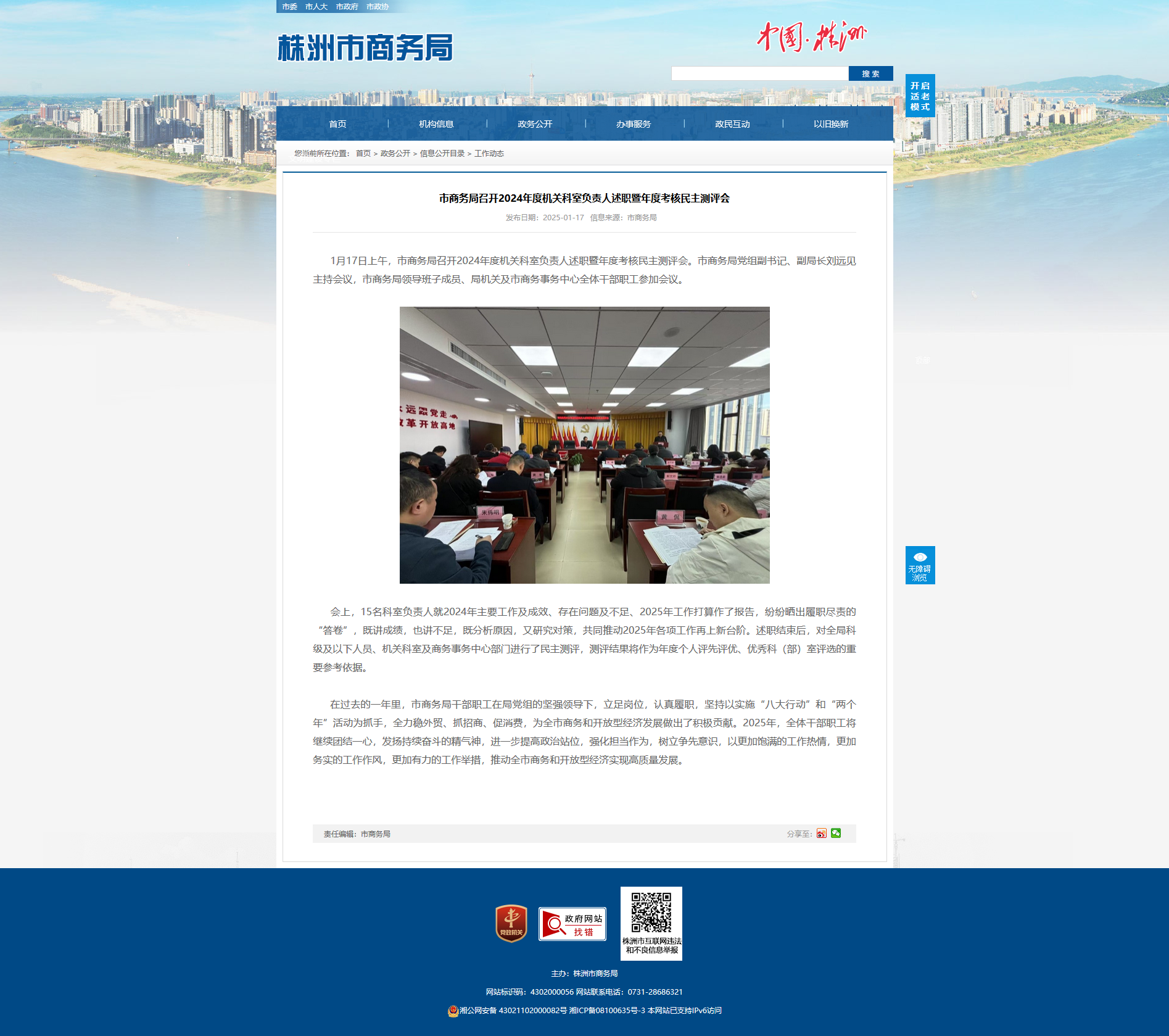 1月17日上午,市商务局召开2024年度机关科室负责人述职暨年度考核民主测评会。市商务局党组副书记、副局长刘远见主持会议,市商务局领导班子成员、局机关及市商务事务中心全体干部职工参加会议。