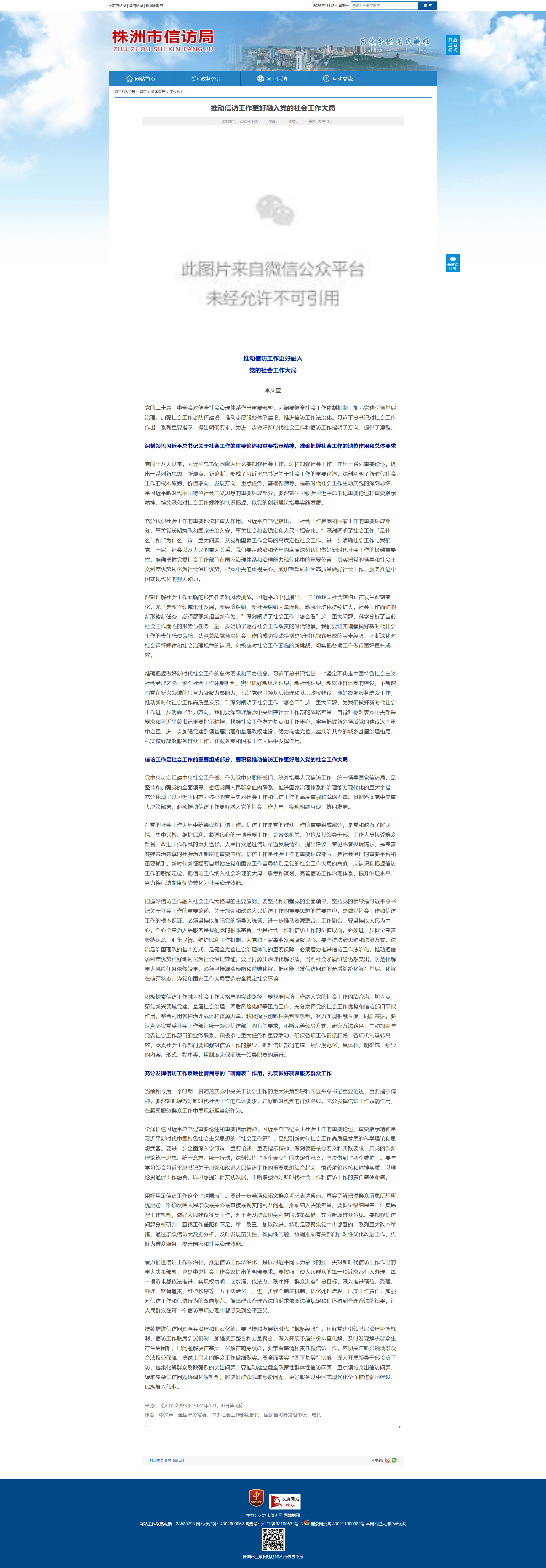 积极探索信访工作融入社会工作大格局的实践路径。要找准信访工作融入党的社会工作的结合点、切入点,聚焦新兴领域党建、基层社会治理、矛盾风险化解等重点工作,充分发挥党的社会工作优势和信访部门职能作用,整合利用各种治理载体和资源力量,积极探索创新相关制度机制,努力实现相融互促、同频共振。要认真落实党委社会工作部门统一领导信访部门的有关要求,不断完善领导方式、研究方法路径,主动加强与党委社会工作部门的业务联系,积极参与重大任务和重要活动,确保各项工作衔接顺畅、各项机制运转高效。党委社会工作部门要加强对信访工作的指导,把对信访部门的统一领导规范化、具体化,明确统一领导的内容、形式、程序等,用制度来保证统一领导职责的履行。