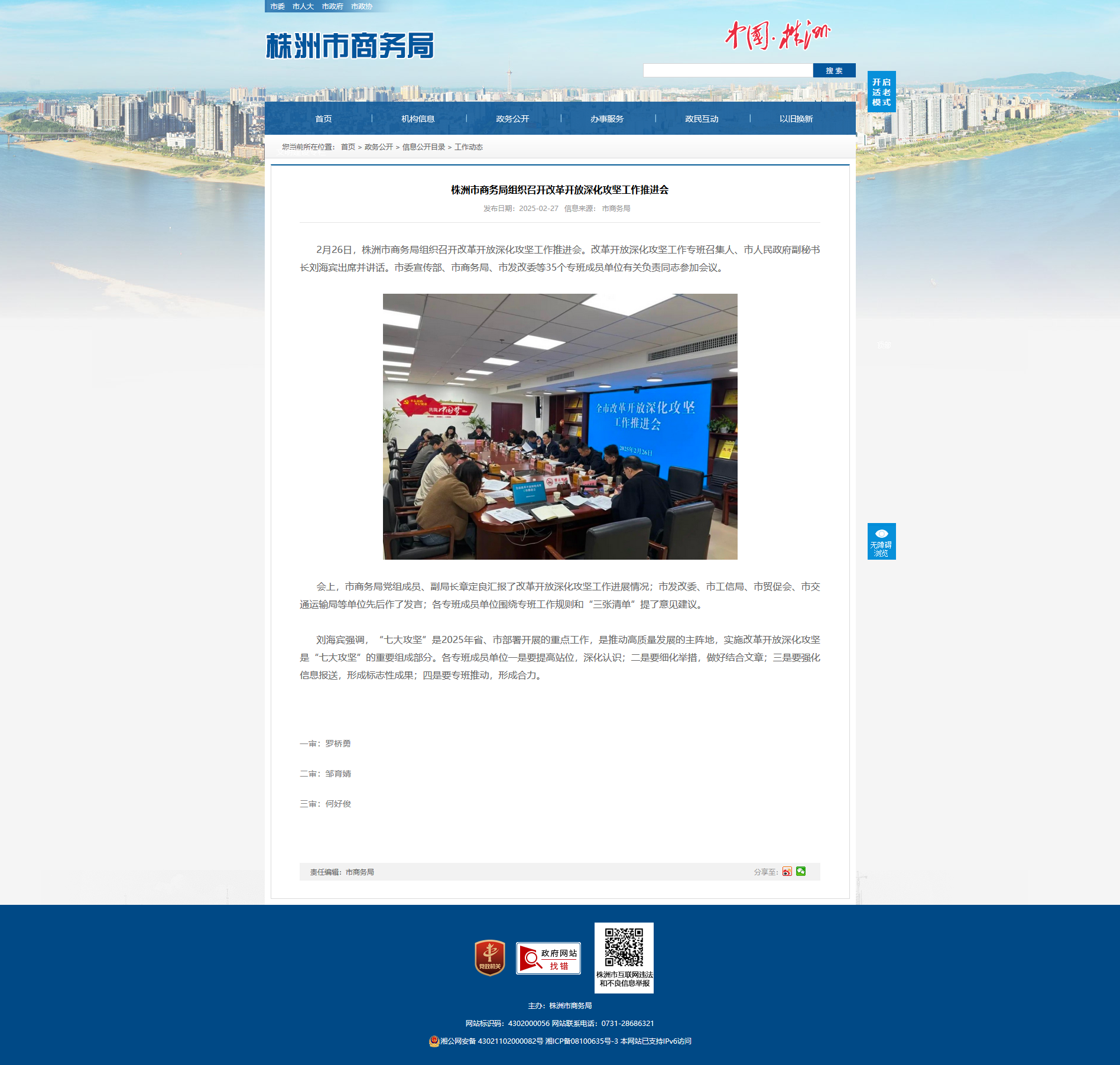 2月26日,株洲市商务局组织召开改革开放深化攻坚工作推进会。改革开放深化攻坚工作专班召集人、市人民政府副秘书长刘海宾出席并讲话。市委宣传部、市商务局、市发改委等35个专班成员单位有关负责同志参加会议。