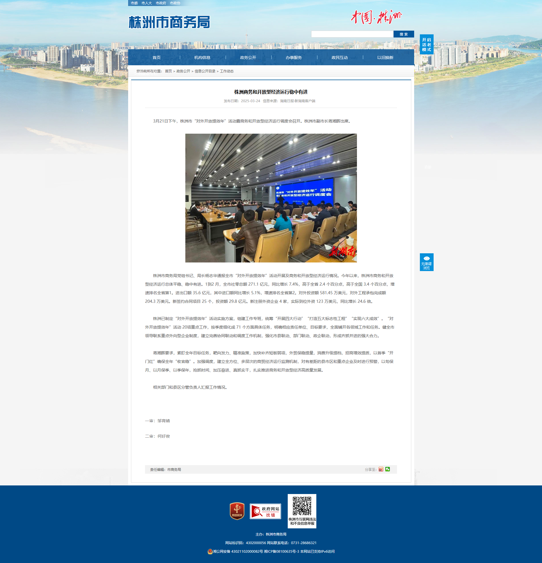 株洲市商务局党组书记、局长杨志华通报全市“对外开放提效年”活动开展及商务和开放型经济运行情况。今年以来,株洲市商务和开放型经济运行总体平稳、稳中有进。1到2 月,全市社零总额 271.1 亿元,同比增长 7.4%,高于全省 2.4 个百分点,高于全国 3.4 个百分点,增速排名全省第1。进出口额 35.6 亿元,其中进口额同比增长 5.1%,增速排名全省第2。对外投资额 581.45 万美元,对外工程承包完成额 204.3 万美元。新签约合同项目 25 个,投资额 29.8 亿元。新注册外资企业 4 家,实际到位外资 123 万美元,同比增长 24.6 倍。