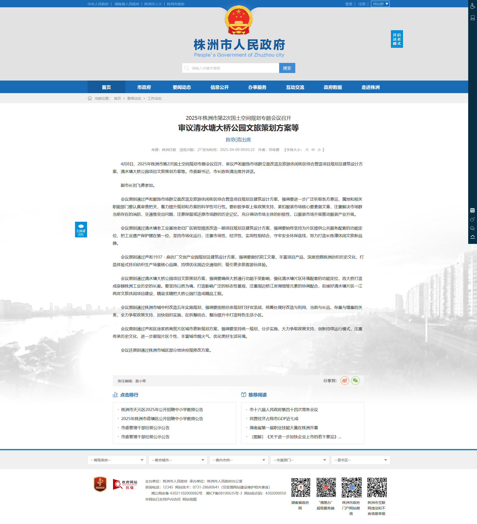 4月8日,2025年株洲市第2次国土空间规划专题会议召开,审议芦淞服饰市场群立面改造及旅游休闲街区综合营造项目规划及建筑设计方案、清水塘大桥公园项目文旅策划方案等。市委副书记、市长陈恢清出席并讲话。