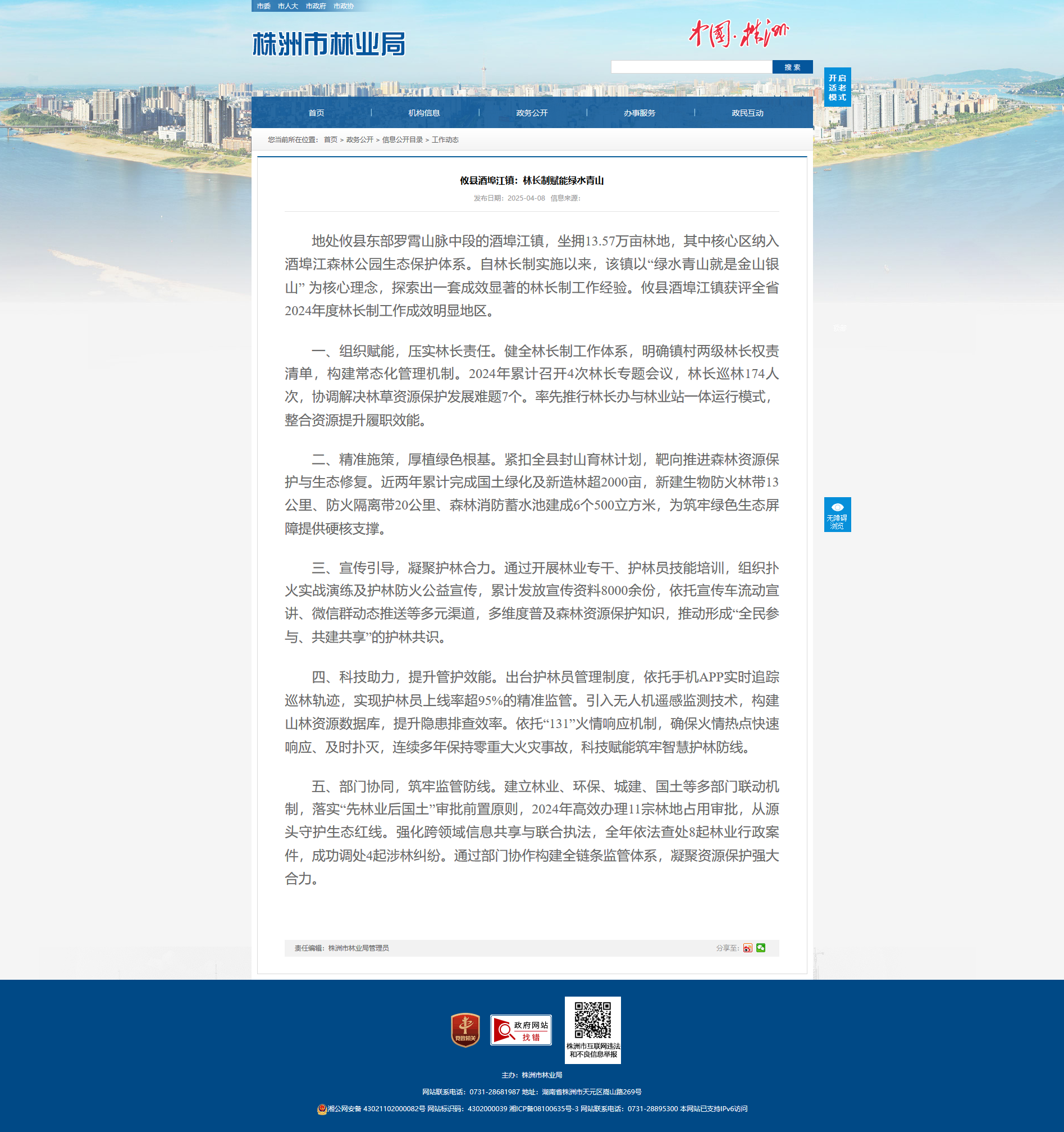 一、组织赋能,压实林长责任。健全林长制工作体系,明确镇村两级林长权责清单,构建常态化管理机制。2024年累计召开4次林长专题会议,林长巡林174人次,协调解决林草资源保护发展难题7个。率先推行林长办与林业站一体运行模式,整合资源提升履职效能。