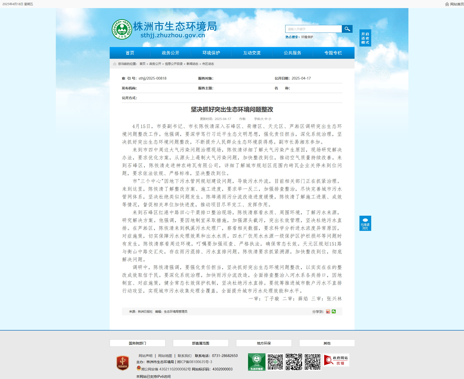 4月15日,市委副书记、市长陈恢清深入石峰区、荷塘区、天元区、芦淞区调研突出生态环境问题整改工作。他强调,要深学笃行习近平生态文明思想,强化责任担当,深化系统治理,坚决抓好突出生态环境问题整改,不断提升人民群众生态环境获得感。副市长易湘东参加。
