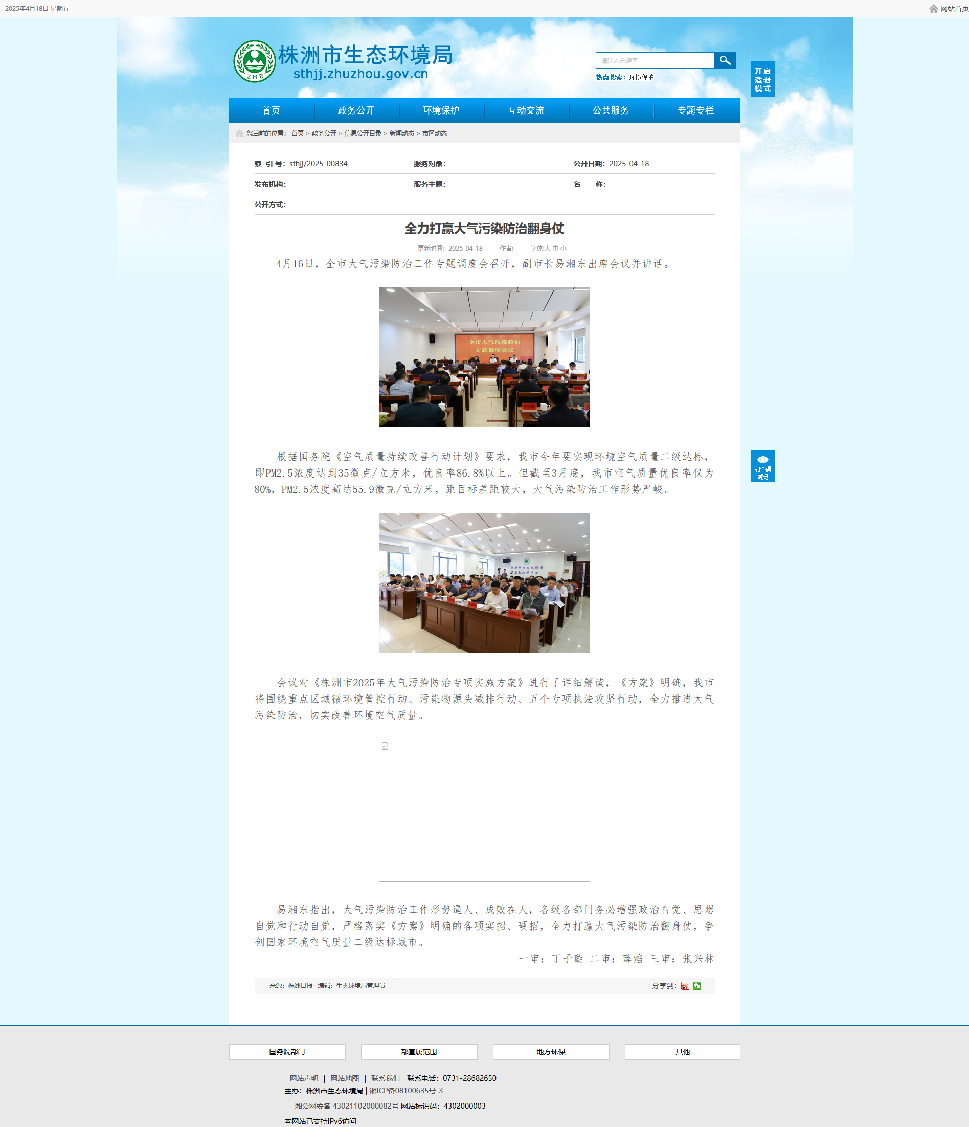 会议对《株洲市2025年大气污染防治专项实施方案》进行了详细解读,《方案》明确,我市将围绕重点区域微环境管控行动、污染物源头减排行动、五个专项执法攻坚行动,全力推进大气污染防治,切实改善环境空气质量。