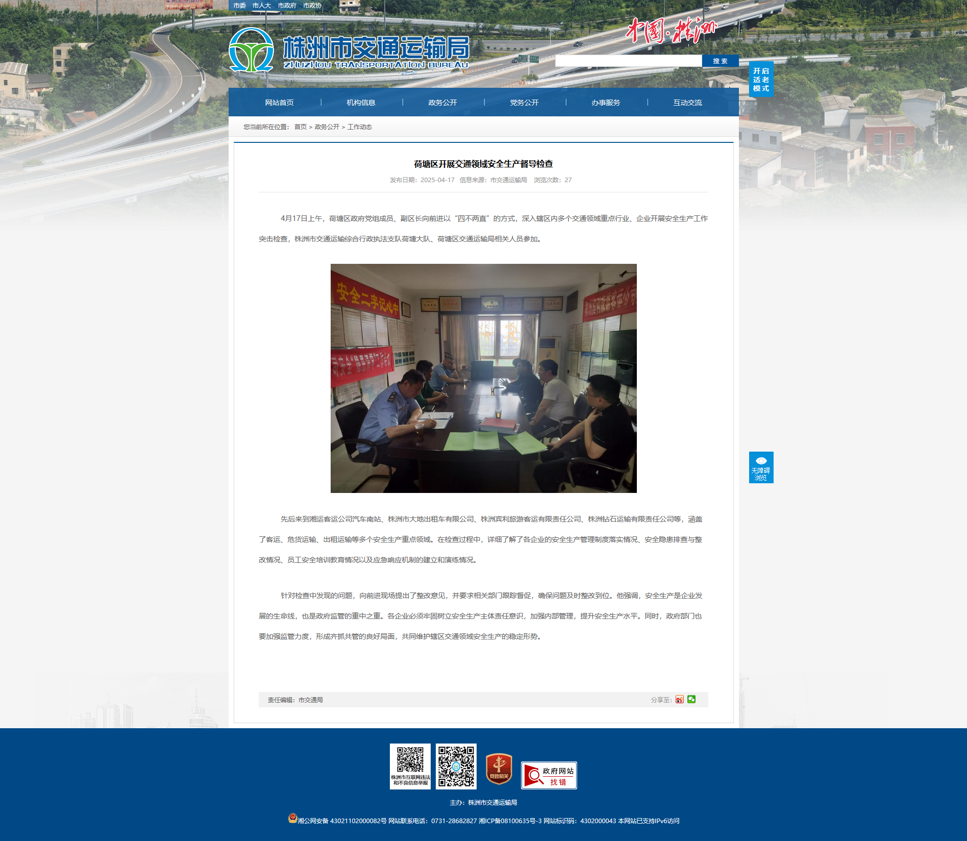 4月17日上午,荷塘区政府党组成员、副区长向前进以“四不两直”的方式,深入辖区内多个交通领域重点行业、企业开展安全生产工作突击检查,株洲市交通运输综合行政执法支队荷塘大队、荷塘区交通运输局相关人员参加。