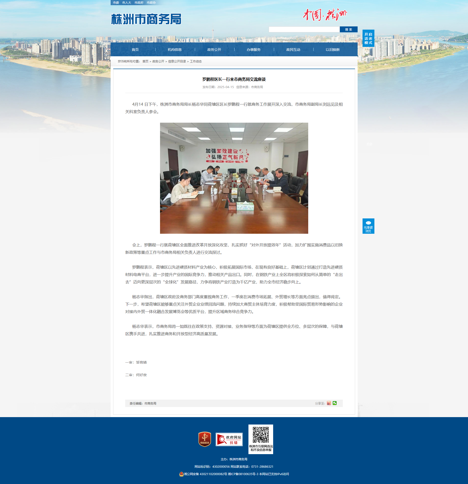 4月14 日下午,株洲市商务局局长杨志华同荷塘区区长罗鹏程一行就商务工作展开深入交流,市商务局副局长刘远见及相关科室负责人参会。