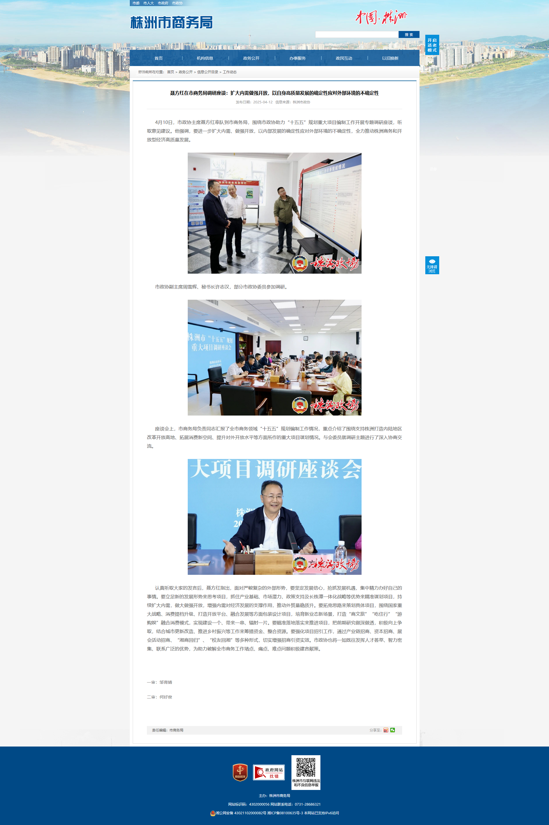 4月10日,市政协主席聂方红率队到市商务局,围绕市政协助力“十五五”规划重大项目编制工作开展专题调研座谈,听取意见建议。他强调,要进一步扩大内需、做强开放,以内部发展的确定性应对外部环境的不确定性,全力推动株洲商务和开放型经济高质量发展。