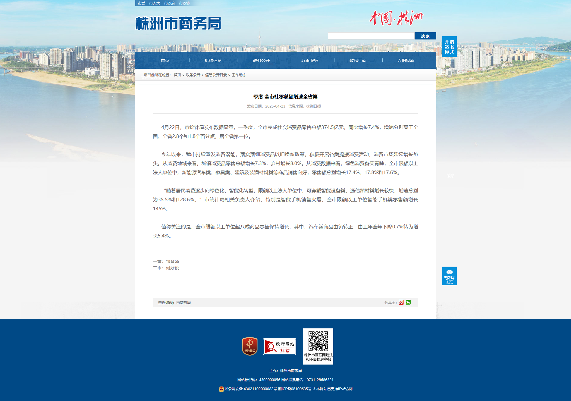 4月22日,市统计局发布数据显示,一季度,全市完成社会消费品零售总额374.5亿元,同比增长7.4%,增速分别高于全国、全省2.8个和1.8个百分点,居全省第一位。