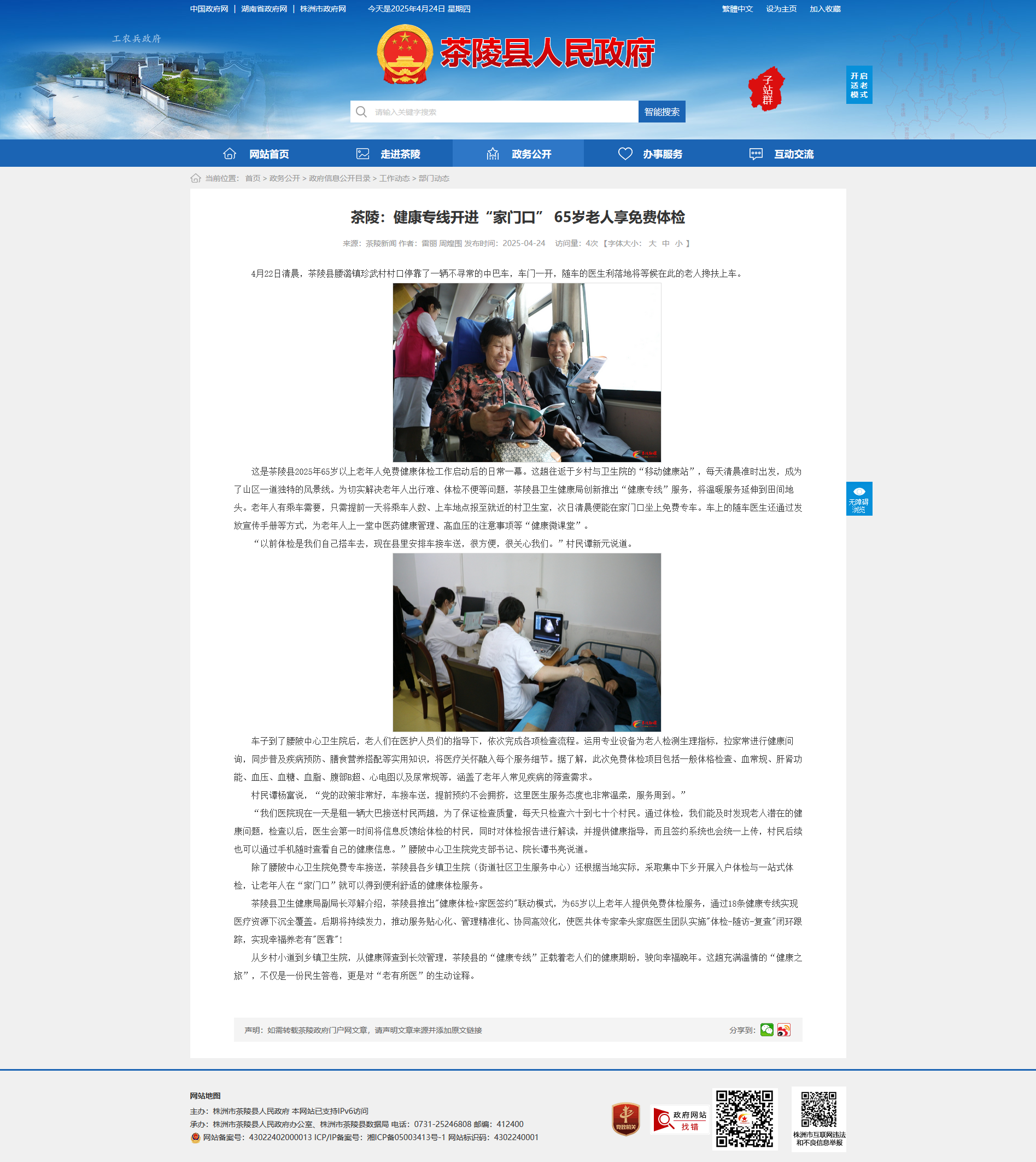 茶陵县卫生健康局副局长邓解介绍,茶陵县推出"健康体检 家医签约"联动模式,为65岁以上老年人提供免费体检服务,通过18条健康专线实现医疗资源下沉全覆盖。后期将持续发力,推动服务贴心化、管理精准化、协同高效化,使医共体专家牵头家庭医生团队实施"体检-随访-复查"闭环跟踪,实现幸福养老有"医靠"!