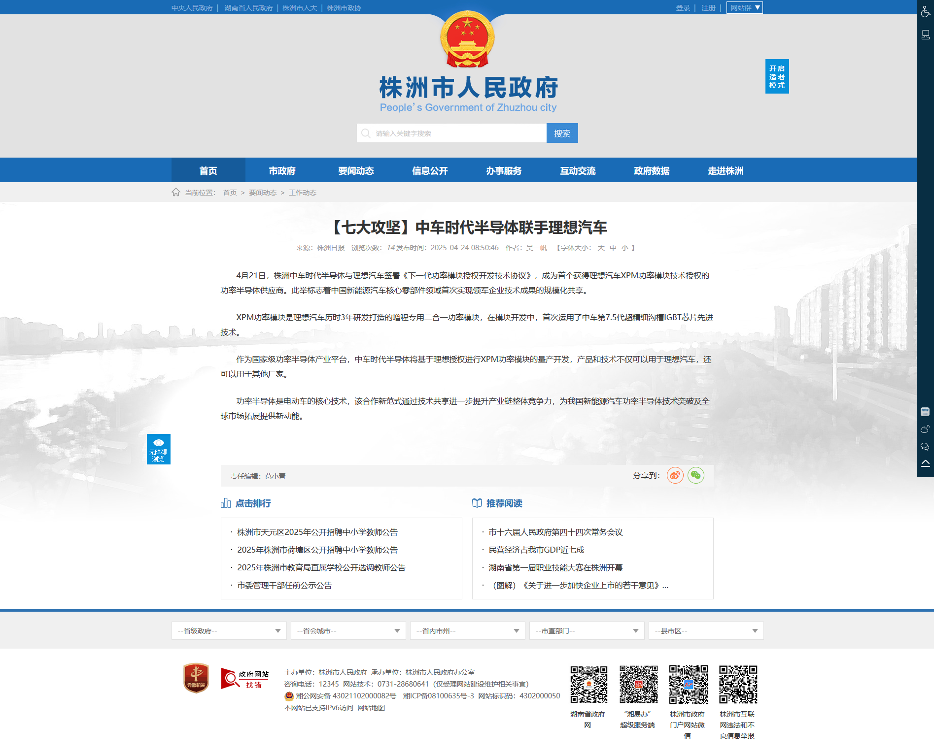 4月21日,株洲中车时代半导体与理想汽车签署《下一代功率模块授权开发技术协议》,成为首个获得理想汽车XPM功率模块技术授权的功率半导体供应商。此举标志着中国新能源汽车核心零部件领域首次实现领军企业技术成果的规模化共享。
