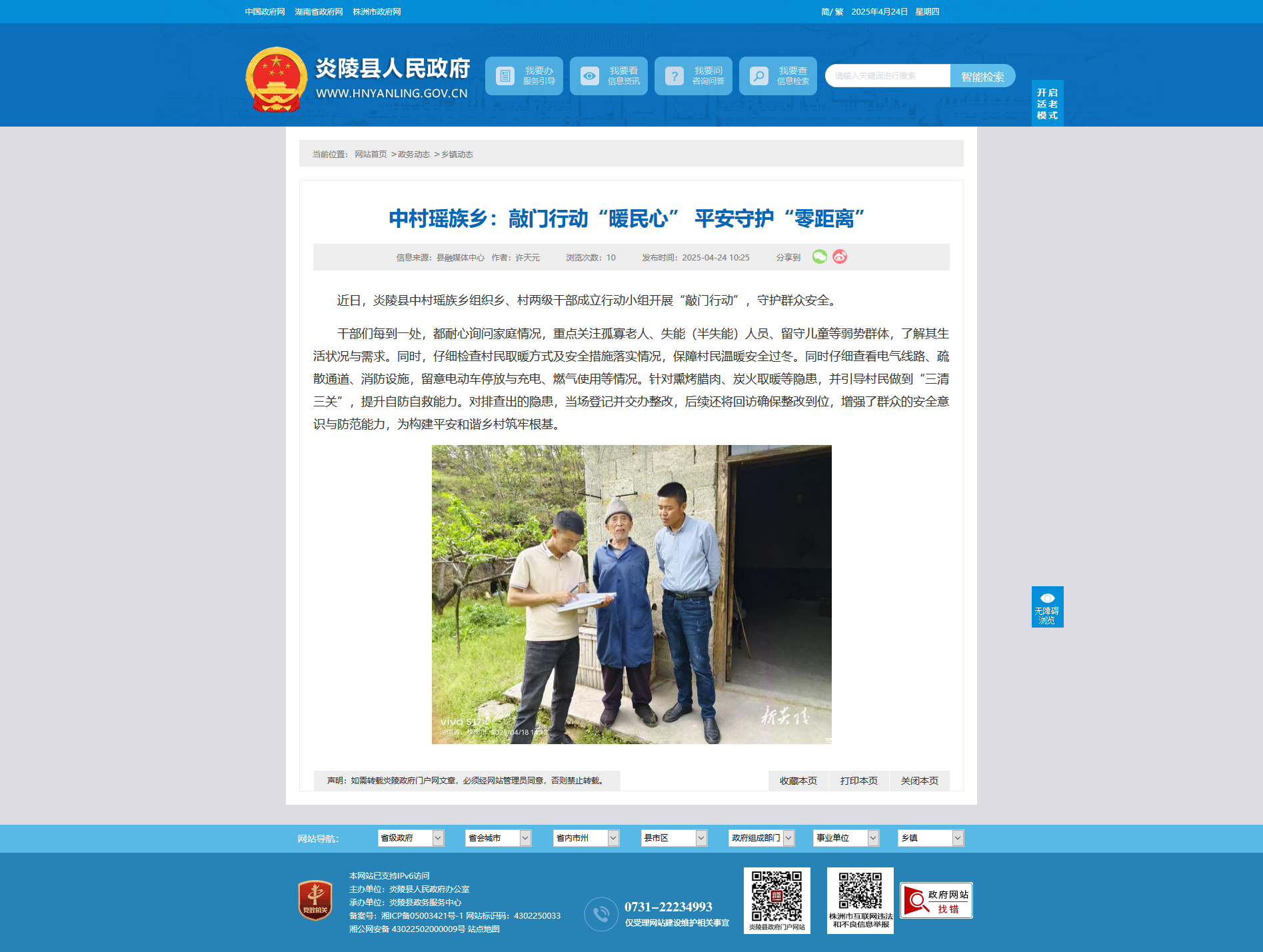 近日,炎陵县中村瑶族乡组织乡、村两级干部成立行动小组开展“敲门行动”,守护群众安全。