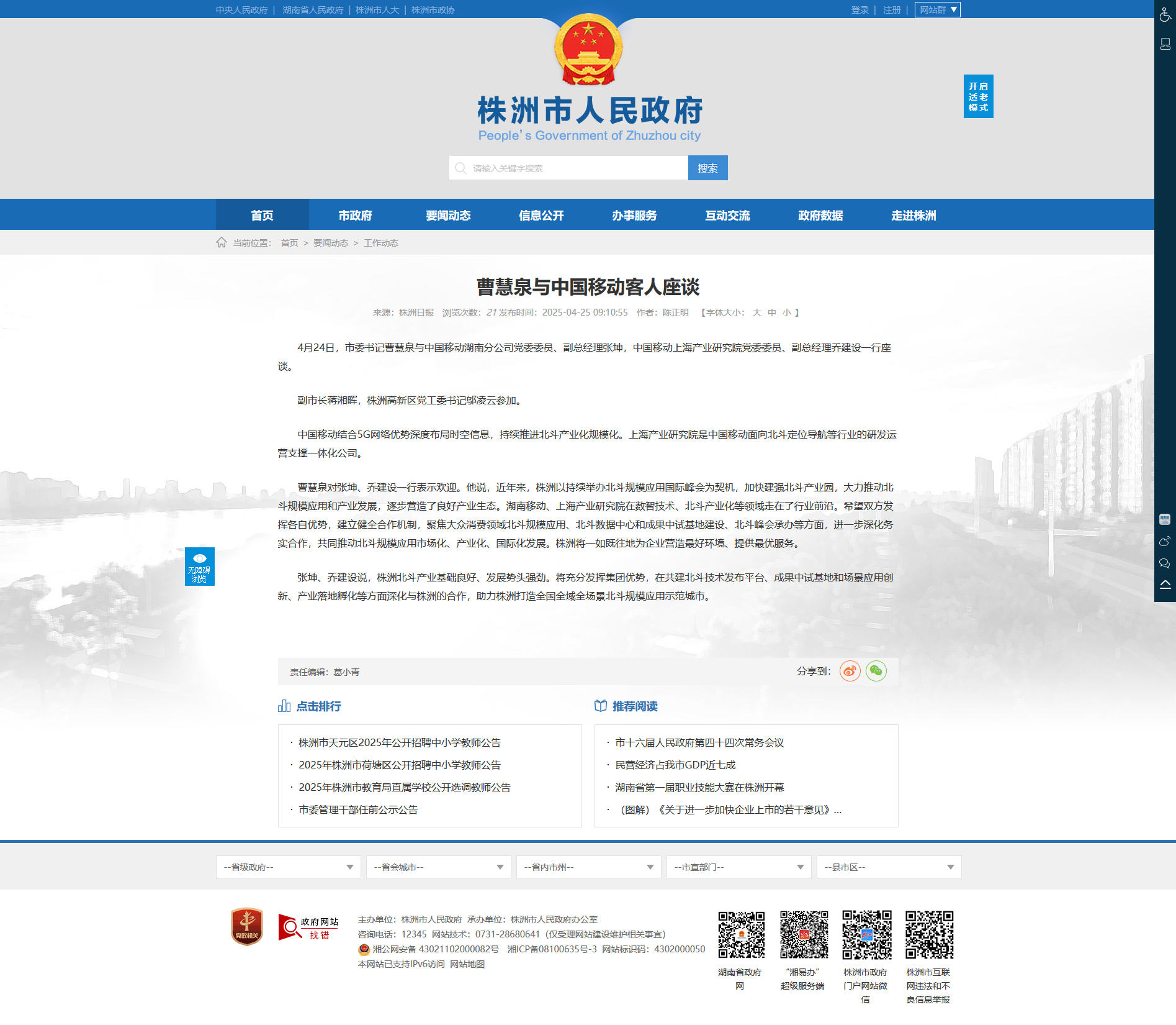 曹慧泉对张坤、乔建设一行表示欢迎。他说,近年来,株洲以持续举办北斗规模应用国际峰会为契机,加快建强北斗产业园,大力推动北斗规模应用和产业发展,逐步营造了良好产业生态。湖南移动、上海产业研究院在数智技术、北斗产业化等领域走在了行业前沿。希望双方发挥各自优势,建立健全合作机制,聚焦大众消费领域北斗规模应用、北斗数据中心和成果中试基地建设、北斗峰会承办等方面,进一步深化务实合作,共同推动北斗规模应用市场化、产业化、国际化发展。株洲将一如既往地为企业营造最好环境、提供最优服务。