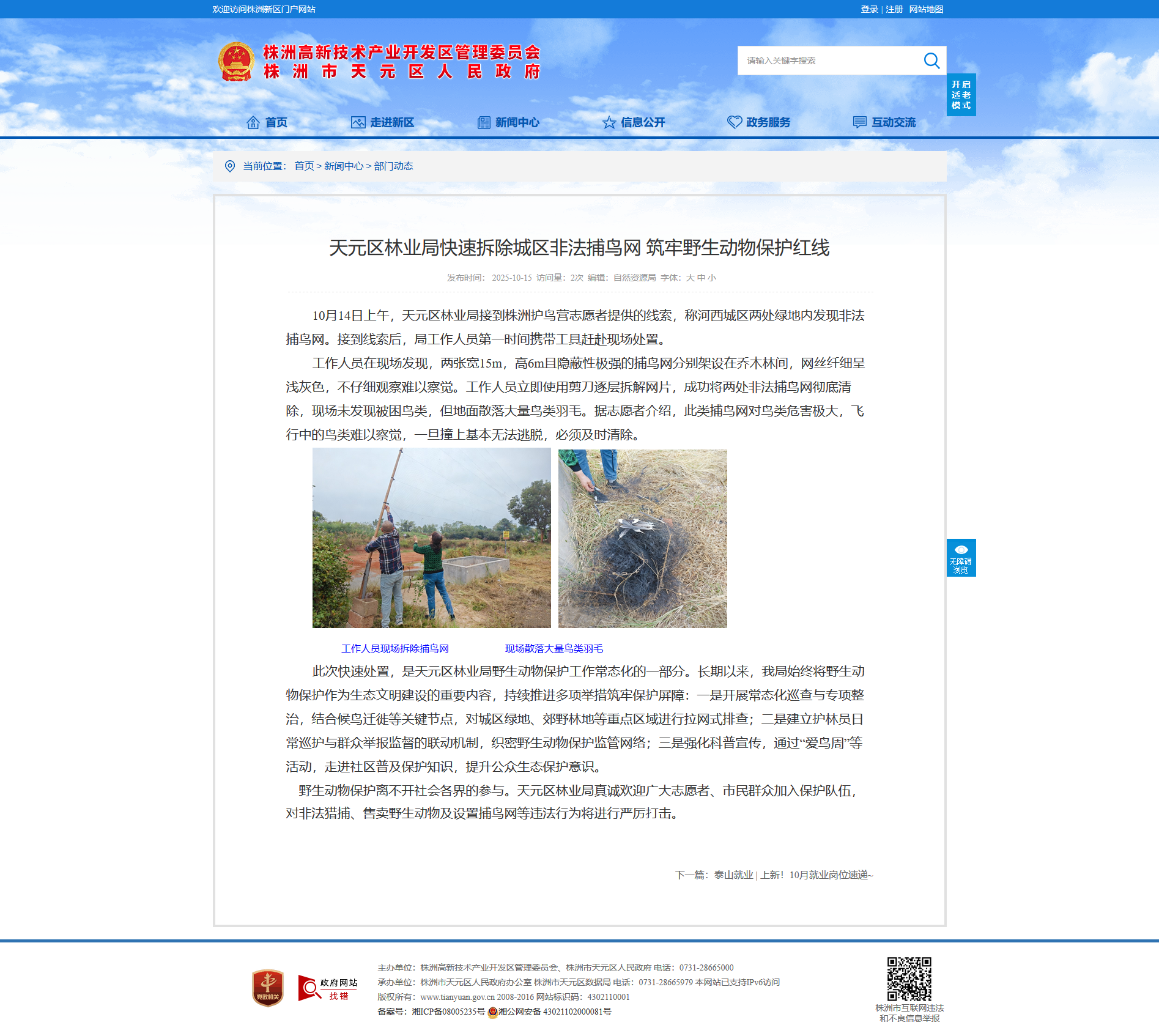 野生动物保护离不开社会各界的参与。天元区林业局真诚欢迎广大志愿者、市民群众加入保护队伍,对非法猎捕、售卖野生动物及设置捕鸟网等违法行为将进行严厉打击。