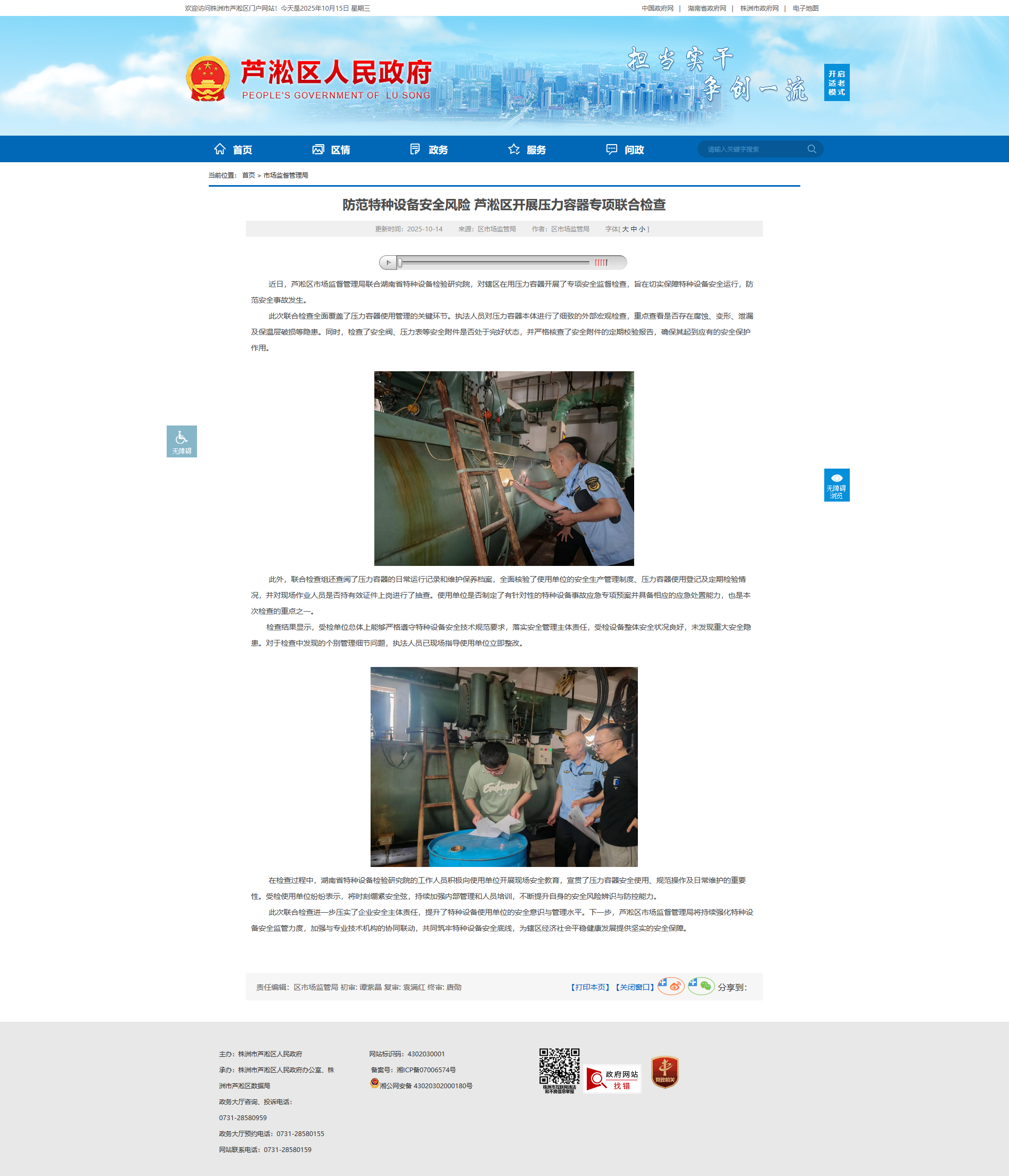 近日,芦淞区市场监督管理局联合湖南省特种设备检验研究院,对辖区在用压力容器开展了专项安全监督检查,旨在切实保障特种设备安全运行,防范安全事故发生。