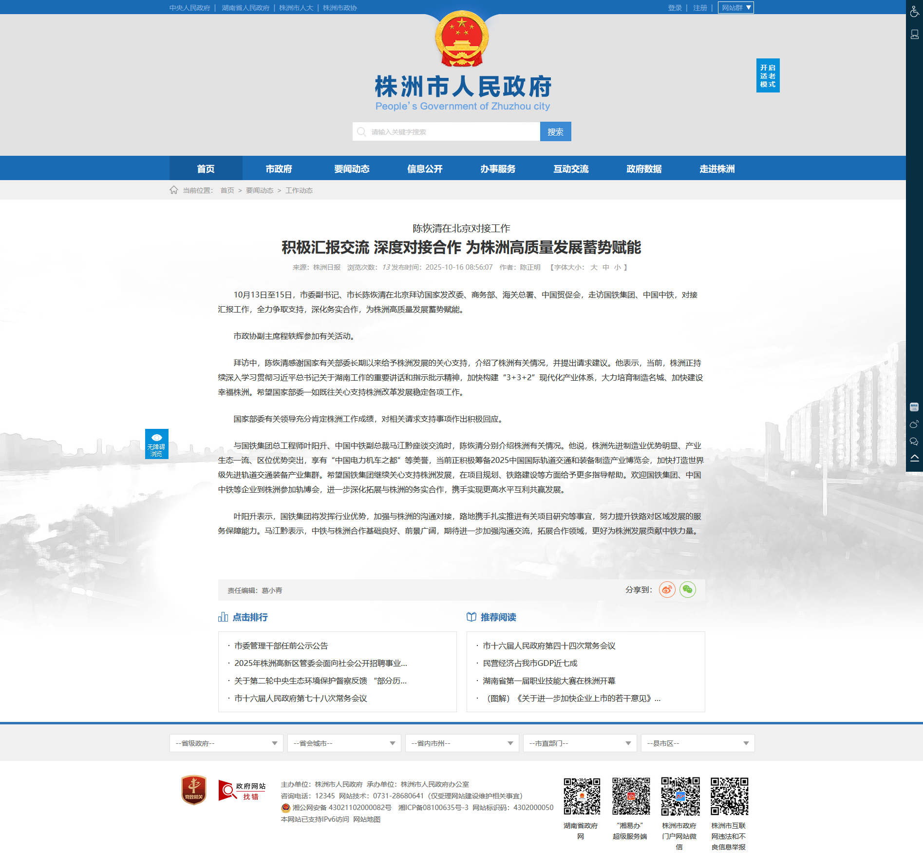 10月13日至15日,市委副书记、市长陈恢清在北京拜访国家发改委、商务部、海关总署、中国贸促会,走访国铁集团、中国中铁,对接汇报工作,全力争取支持,深化务实合作,为株洲高质量发展蓄势赋能。