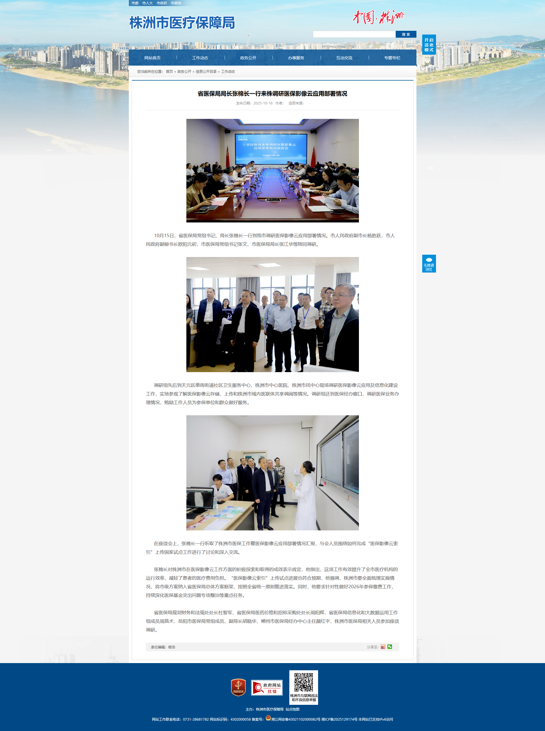 调研组先后到天元区栗雨街道社区卫生服务中心、株洲市中心医院、株洲市民中心现场调研医保影像云应用及信息化建设工作,实地参观了解医保影像云存储、上传和株洲市域内医联体共享调阅等情况。调研组还到医保经办窗口,调研医保业务办理情况,勉励工作人员为参保单位和群众做好服务。
