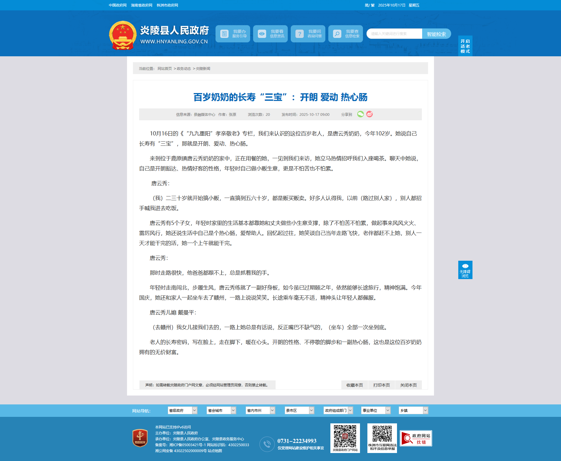 10月16日的《“九九重阳”孝亲敬老》专栏,我们来认识的这位百岁老人,是唐云秀奶奶,今年102岁。她说自己长寿有“三宝”,那就是开朗、爱动、热心肠。