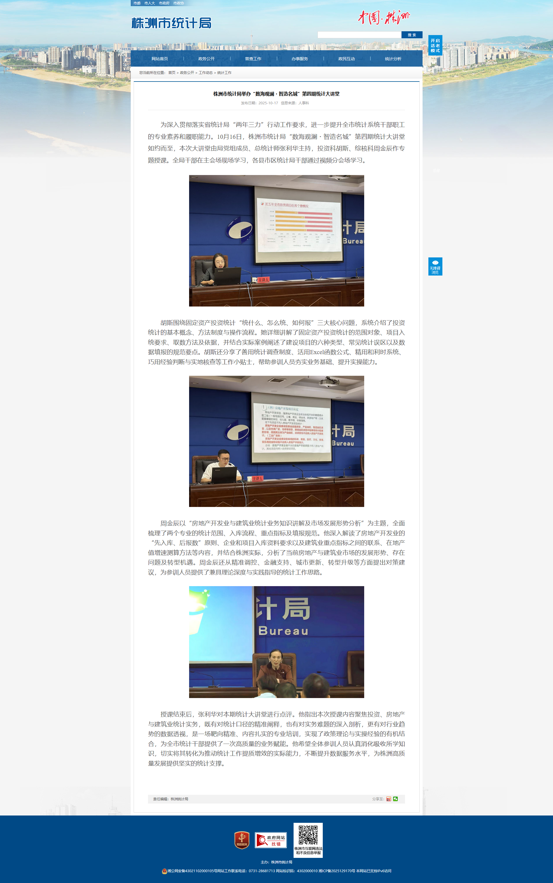 周金辰以“房地产开发业与建筑业统计业务知识讲解及市场发展形势分析”为主题,全面梳理了两个专业的统计范围、入库流程、重点指标及填报规范。他深入解读了房地产开发业的“先入库、后报数”原则、企业和项目入库资料要求以及建筑业重点指标之间的联系、在地产值增速测算方法等内容,并结合株洲实际,分析了当前房地产与建筑业市场的发展形势、存在问题及转型机遇。周金辰还从精准调控、金融支持、城市更新、转型升级等方面提出对策建议,为参训人员提供了兼具理论深度与实践指导的统计工作思路。