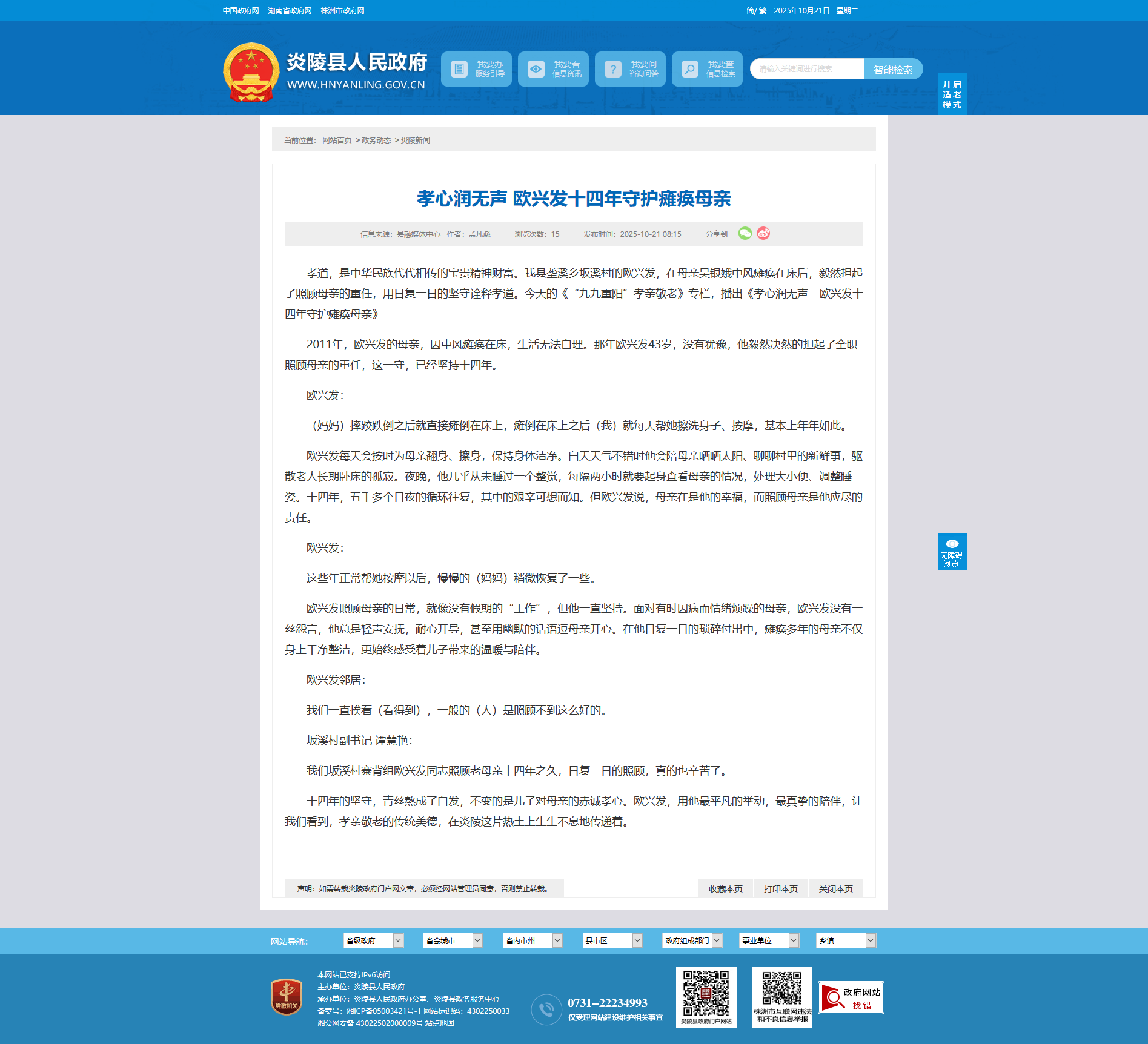 十四年的坚守,青丝熬成了白发,不变的是儿子对母亲的赤诚孝心。欧兴发,用他最平凡的举动,最真挚的陪伴,让我们看到,孝亲敬老的传统美德,在炎陵这片热土上生生不息地传递着。