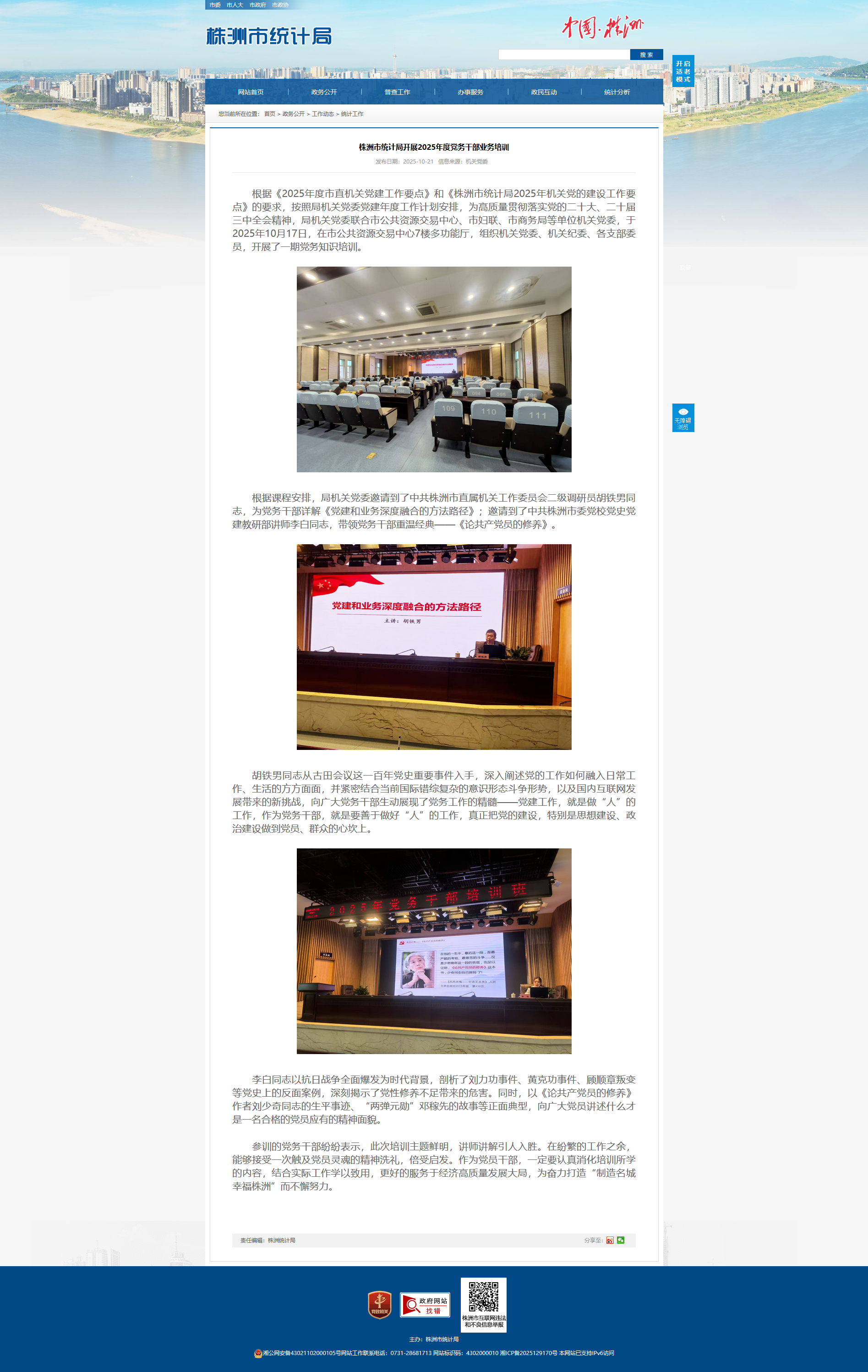 根据《2025年度市直机关党建工作要点》和《株洲市统计局2025年机关党的建设工作要点》的要求,按照局机关党委党建年度工作计划安排,为高质量贯彻落实党的二十大、二十届三中全会精神,局机关党委联合市公共资源交易中心、市妇联、市商务局等单位机关党委,于2025年10月17日,在市公共资源交易中心7楼多功能厅,组织机关党委、机关纪委、各支部委员,开展了一期党务知识培训。