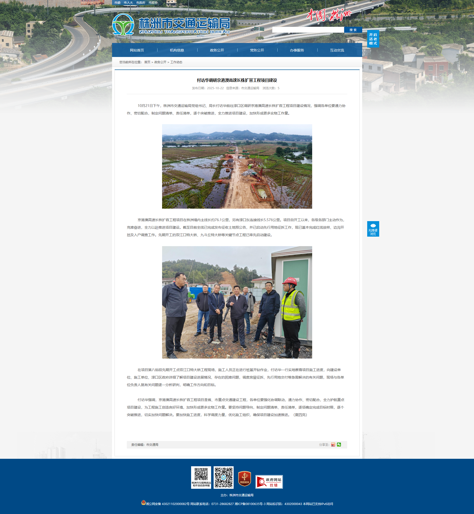 10月21日下午,株洲市交通运输局党组书记、局长付访华前往渌口区调研京港澳高速长株扩容工程项目建设情况,强调各单位要通力协作、密切配合,制定问题清单、责任清单,逐个突破推进,全力推进项目建设,加快形成更多实物工作量。