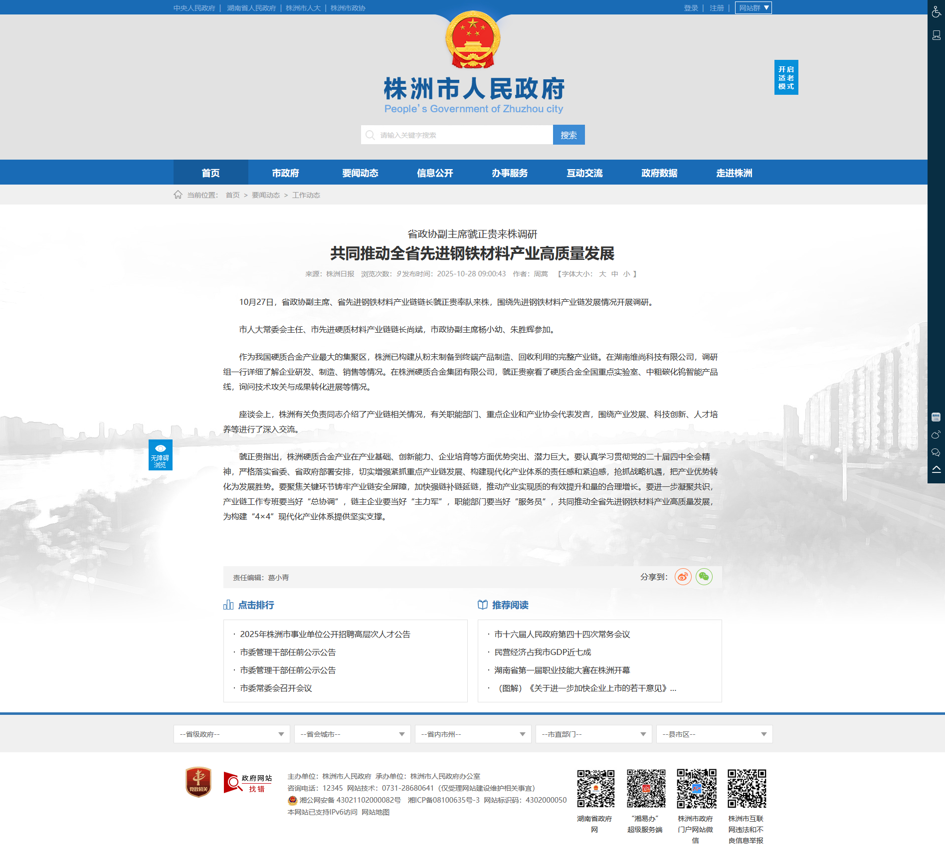 10月27日,省政协副主席、省先进钢铁材料产业链链长虢正贵率队来株,围绕先进钢铁材料产业链发展情况开展调研。