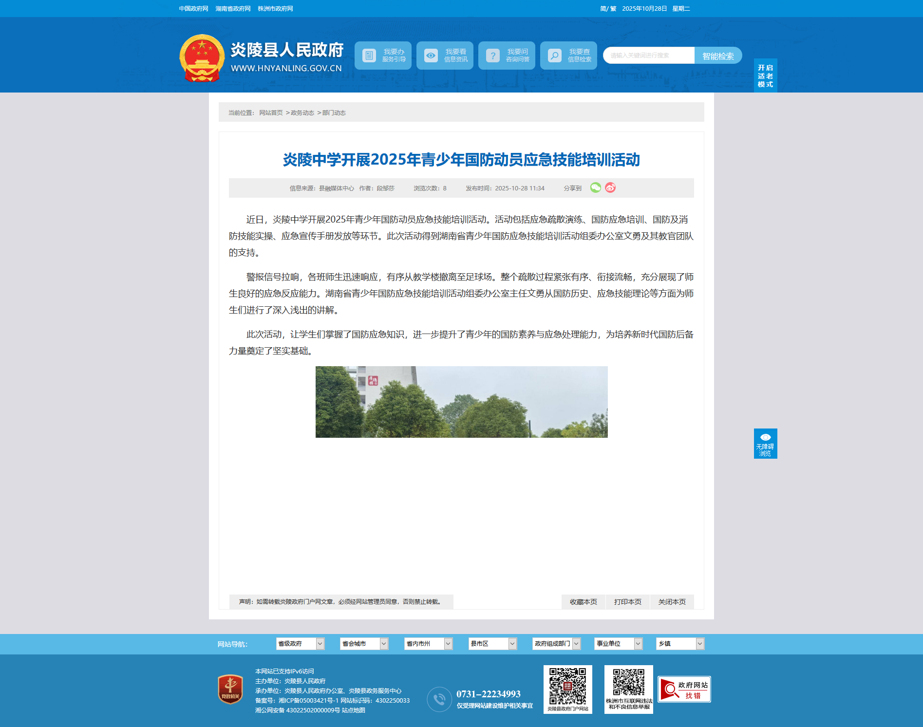近日,炎陵中学开展2025年青少年国防动员应急技能培训活动。活动包括应急疏散演练、国防应急培训、国防及消防技能实操、应急宣传手册发放等环节。此次活动得到湖南省青少年国防应急技能培训活动组委办公室文勇及其教官团队的支持。