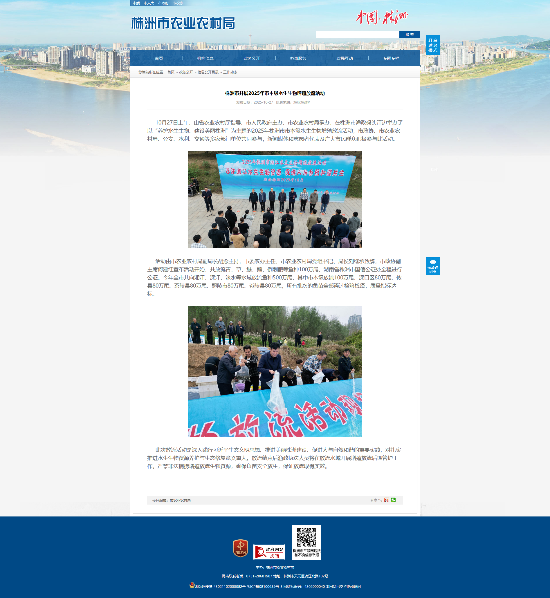 10月27日上午,由省农业农村厅指导、市人民政府主办、市农业农村局承办,在株洲市渔政码头江边举办了以“养护水生生物、建设美丽株洲”为主题的2025年株洲市市本级水生生物增殖放流活动,市政协、市农业农村局、公安、水利、交通等多家部门单位共同参与,新闻媒体和志愿者代表及广大市民群众积极参与此活动。