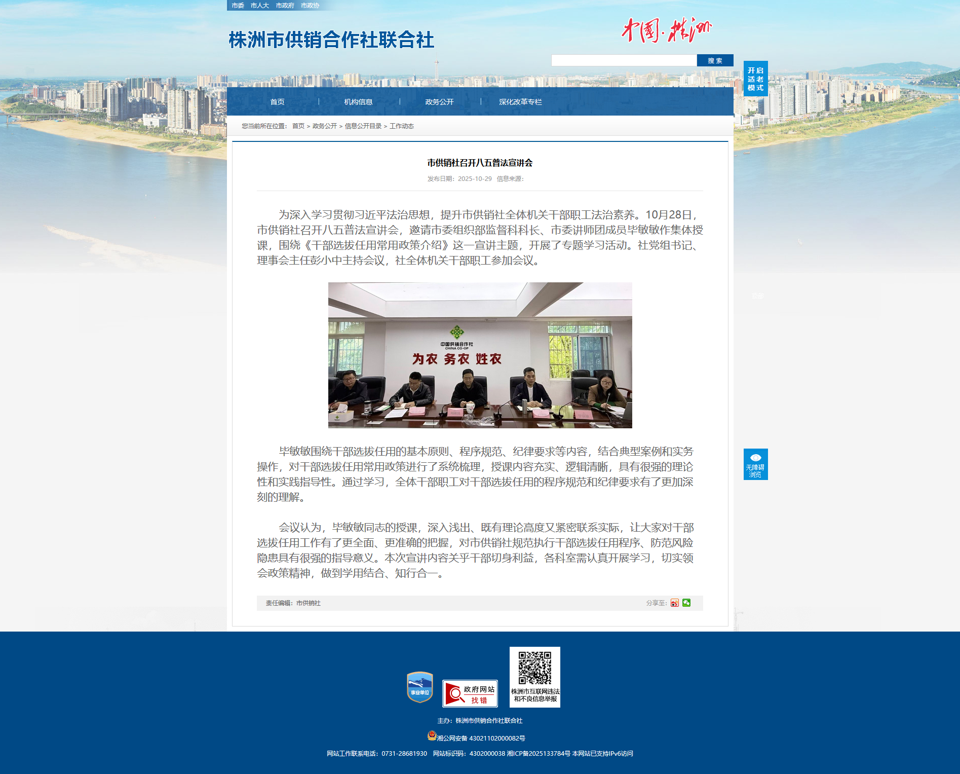 为深入学习贯彻习近平法治思想,提升市供销社全体机关干部职工法治素养。10月28日,市供销社召开八五普法宣讲会,邀请市委组织部监督科科长、市委讲师团成员毕敏敏作集体授课,围绕《干部选拔任用常用政策介绍》这一宣讲主题,开展了专题学习活动。社党组书记、理事会主任彭小中主持会议,社全体机关干部职工参加会议。