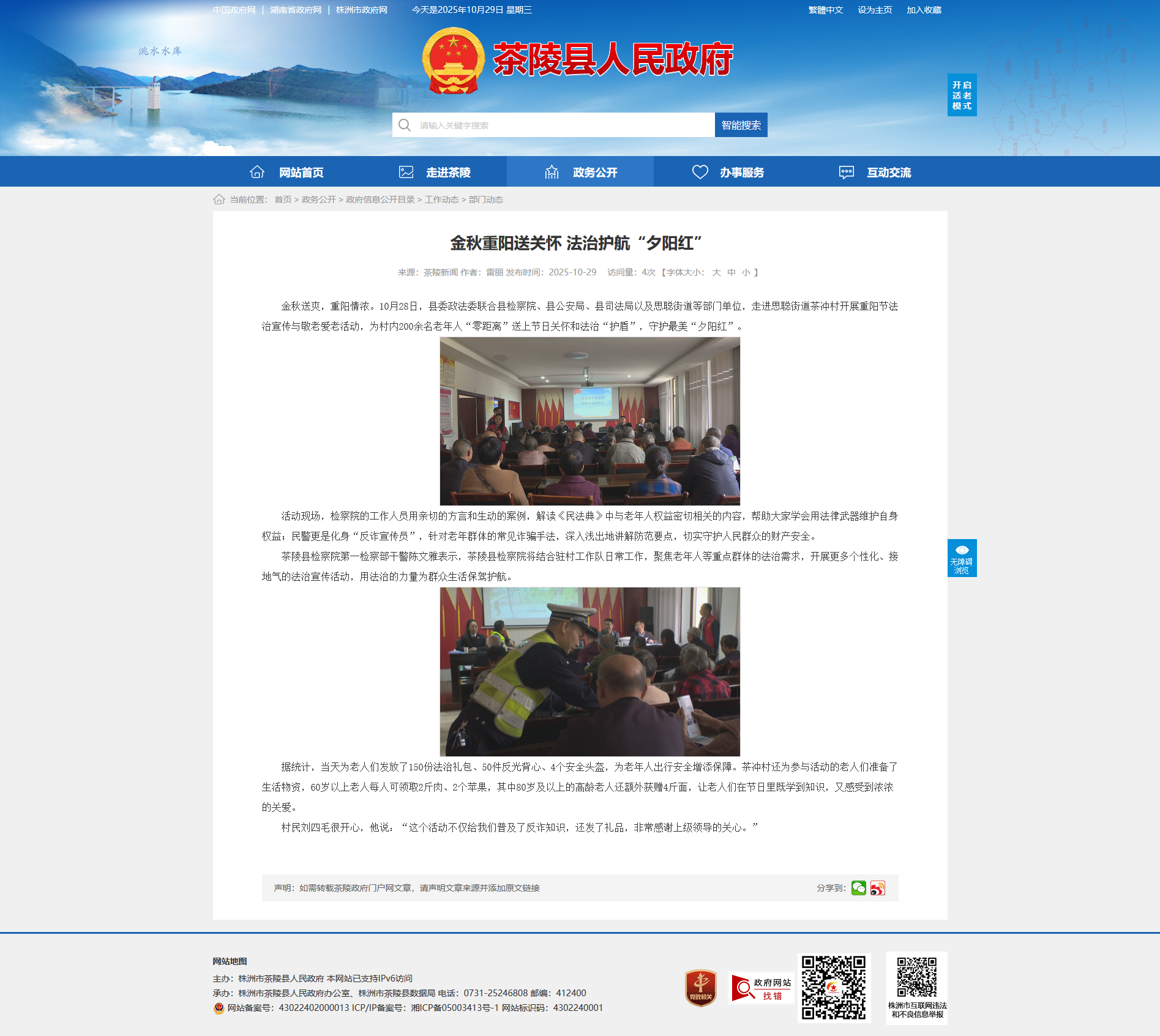 据统计,当天为老人们发放了150份法治礼包、50件反光背心、4个安全头盔,为老年人出行安全增添保障。茶冲村还为参与活动的老人们准备了生活物资,60岁以上老人每人可领取2斤肉、2个苹果,其中80岁及以上的高龄老人还额外获赠4斤面,让老人们在节日里既学到知识,又感受到浓浓的关爱。