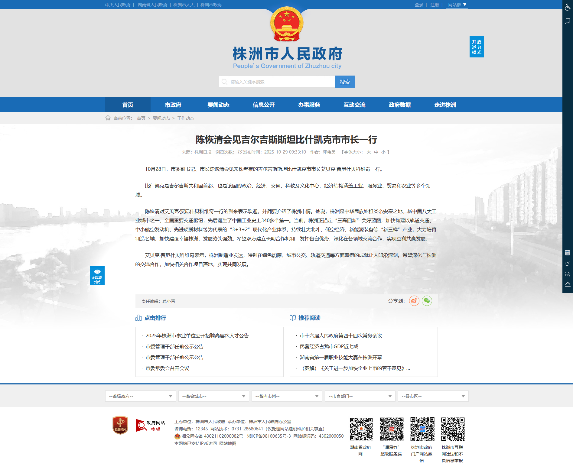陈恢清对艾贝克·贾尼什贝科维奇一行的到来表示欢迎,并简要介绍了株洲市情。他说,株洲是中华民族始祖炎帝安寝之地、新中国八大工业城市之一、全国重要交通枢纽,先后诞生了中国工业史上340多个第一。当前,株洲正锚定“三高四新”美好蓝图,加快构建以轨道交通、中小航空发动机、先进硬质材料等为代表的“3 3 2”现代化产业体系,持续壮大北斗、低空经济、新能源装备等“新三样”产业,大力培育制造名城、加快建设幸福株洲,发展势头强劲。希望双方建立长期合作机制,发挥各自优势,深化在各领域交流合作,实现互利共赢发展。