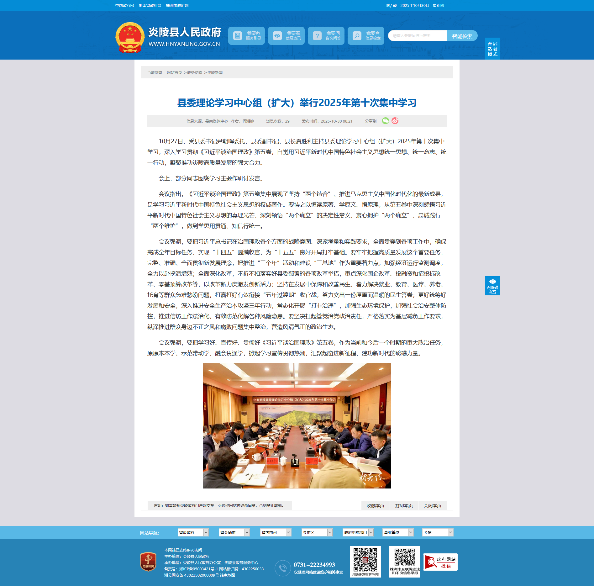 10月27日,受县委书记尹朝晖委托,县委副书记、县长夏胜利主持县委理论学习中心组(扩大)2025年第十次集中学习,深入学习贯彻《习近平谈治国理政》第五卷,自觉用习近平新时代中国特色社会主义思想统一思想、统一意志、统一行动,凝聚推动炎陵高质量发展的强大合力。