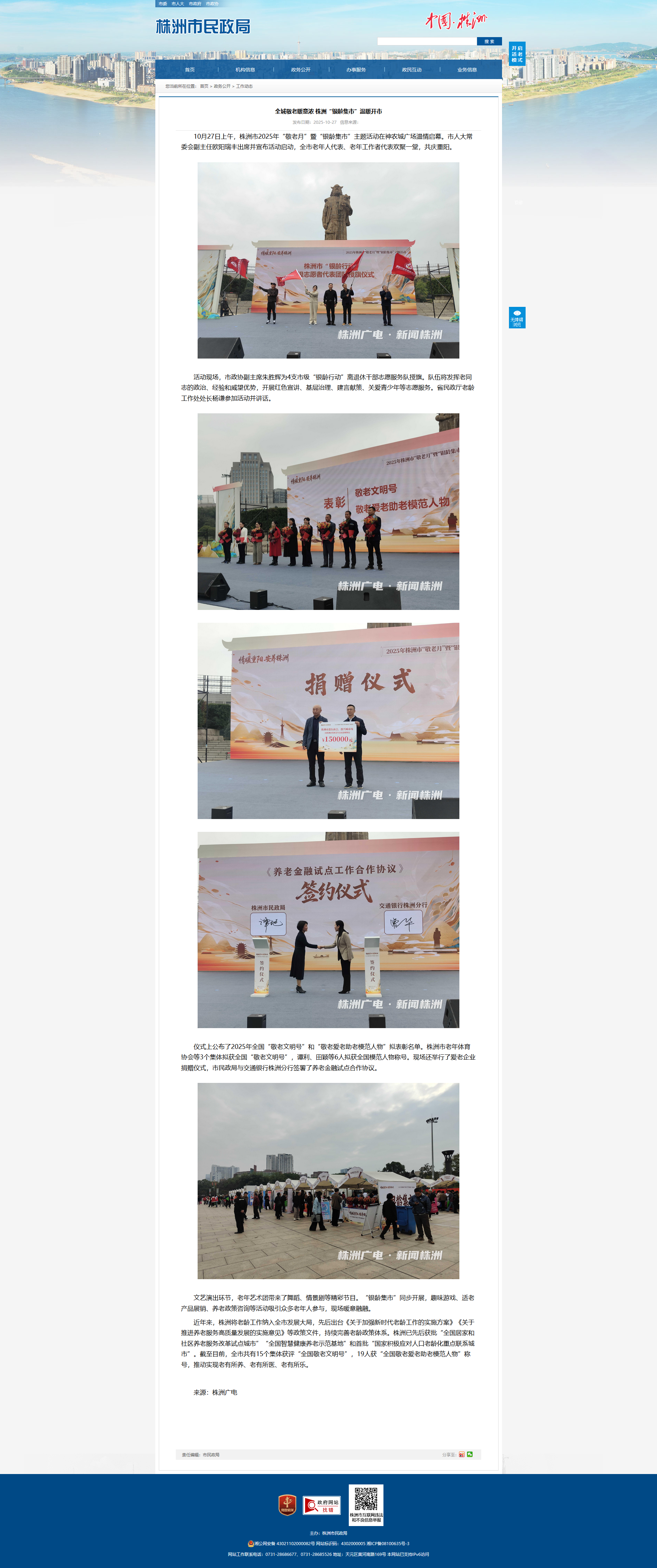 近年来,株洲将老龄工作纳入全市发展大局,先后出台《关于加强新时代老龄工作的实施方案》《关于推进养老服务高质量发展的实施意见》等政策文件,持续完善老龄政策体系。株洲已先后获批“全国居家和社区养老服务改革试点城市”“全国智慧健康养老示范基地”和首批“国家积极应对人口老龄化重点联系城市”。截至目前,全市共有15个集体获评“全国敬老文明号”,19人获“全国敬老爱老助老模范人物”称号,推动实现老有所养、老有所医、老有所乐。