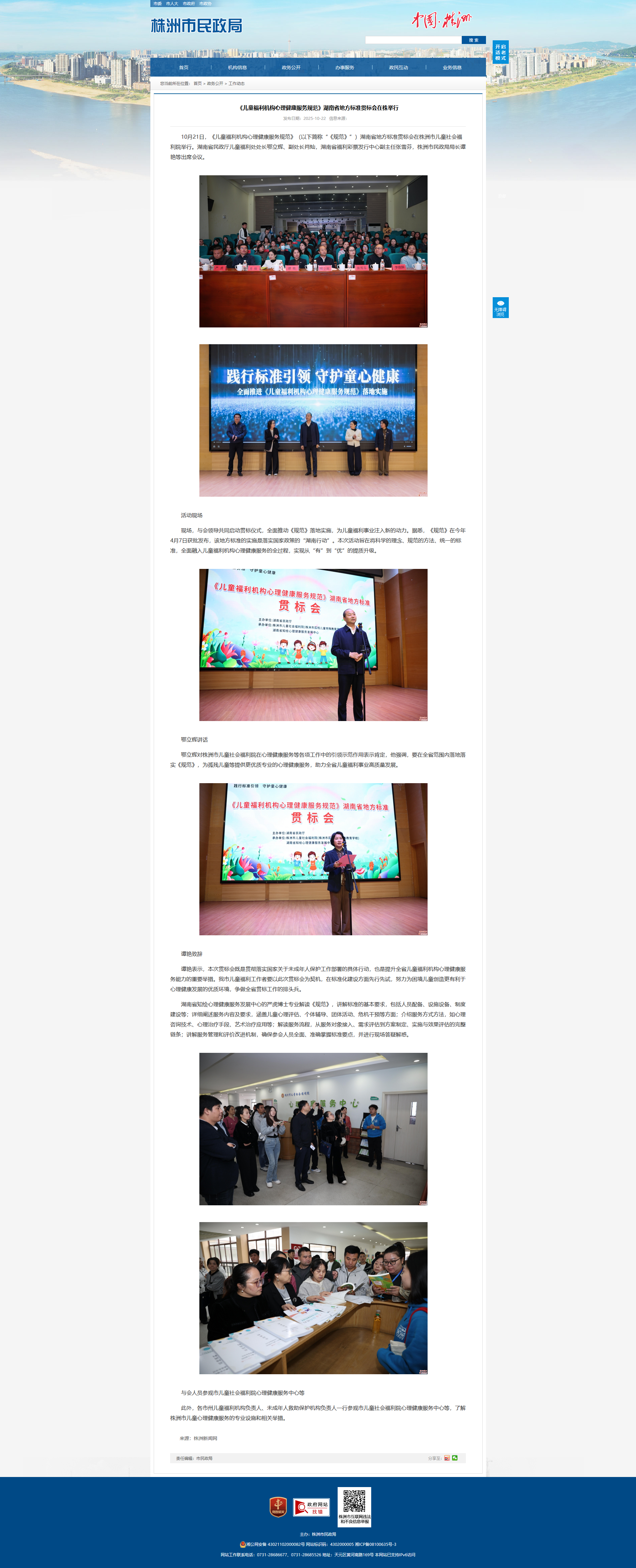 10月21日,《儿童福利机构心理健康服务规范》(以下简称“《规范》”)湖南省地方标准贯标会在株洲市儿童社会福利院举行。湖南省民政厅儿童福利处处长鄂立辉、副处长肖灿,湖南省福利彩票发行中心副主任张雪芬,株洲市民政局局长谭艳等出席会议。