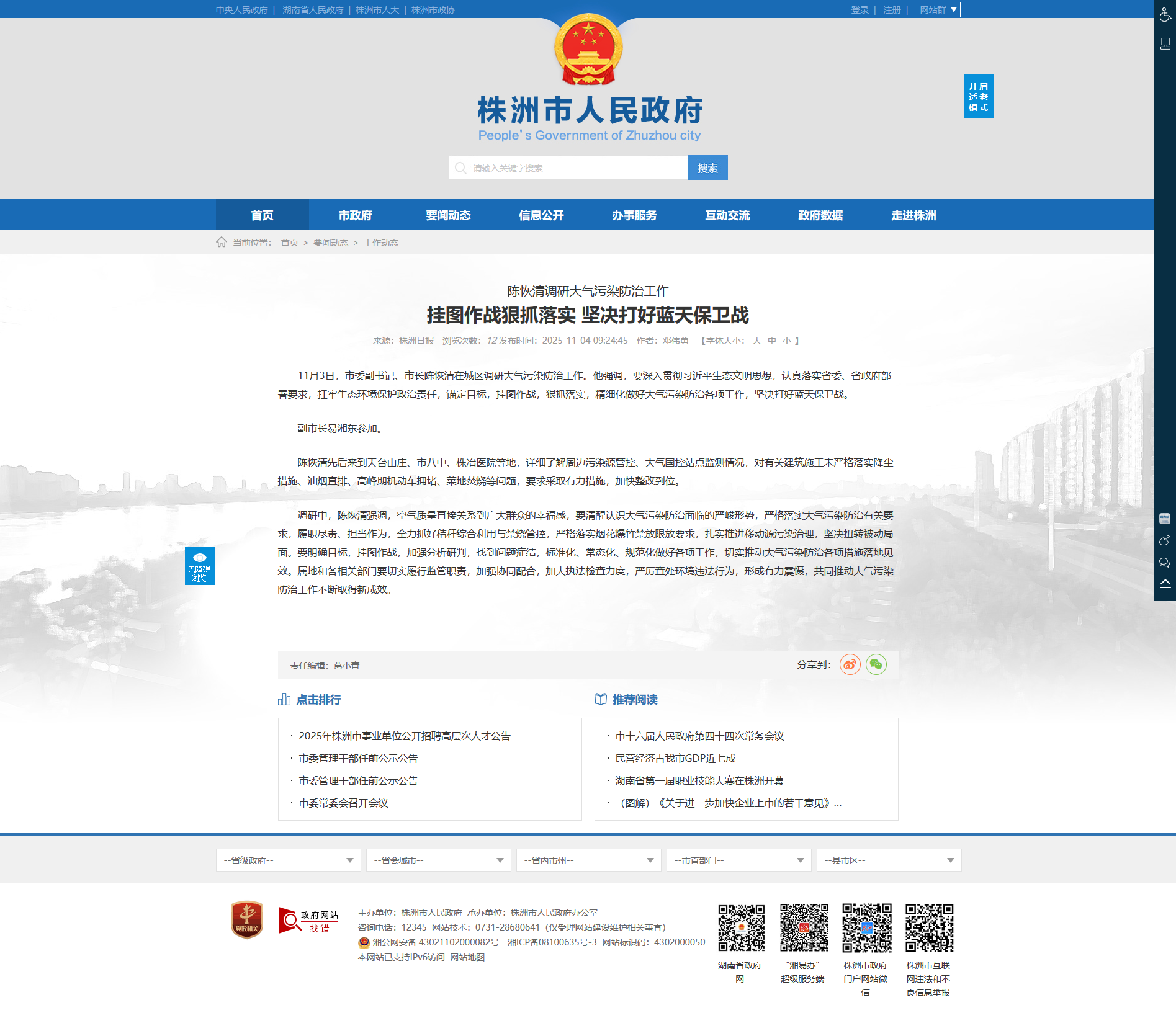 陈恢清先后来到天台山庄、市八中、株冶医院等地,详细了解周边污染源管控、大气国控站点监测情况,对有关建筑施工未严格落实降尘措施、油烟直排、高峰期机动车拥堵、菜地焚烧等问题,要求采取有力措施,加快整改到位。