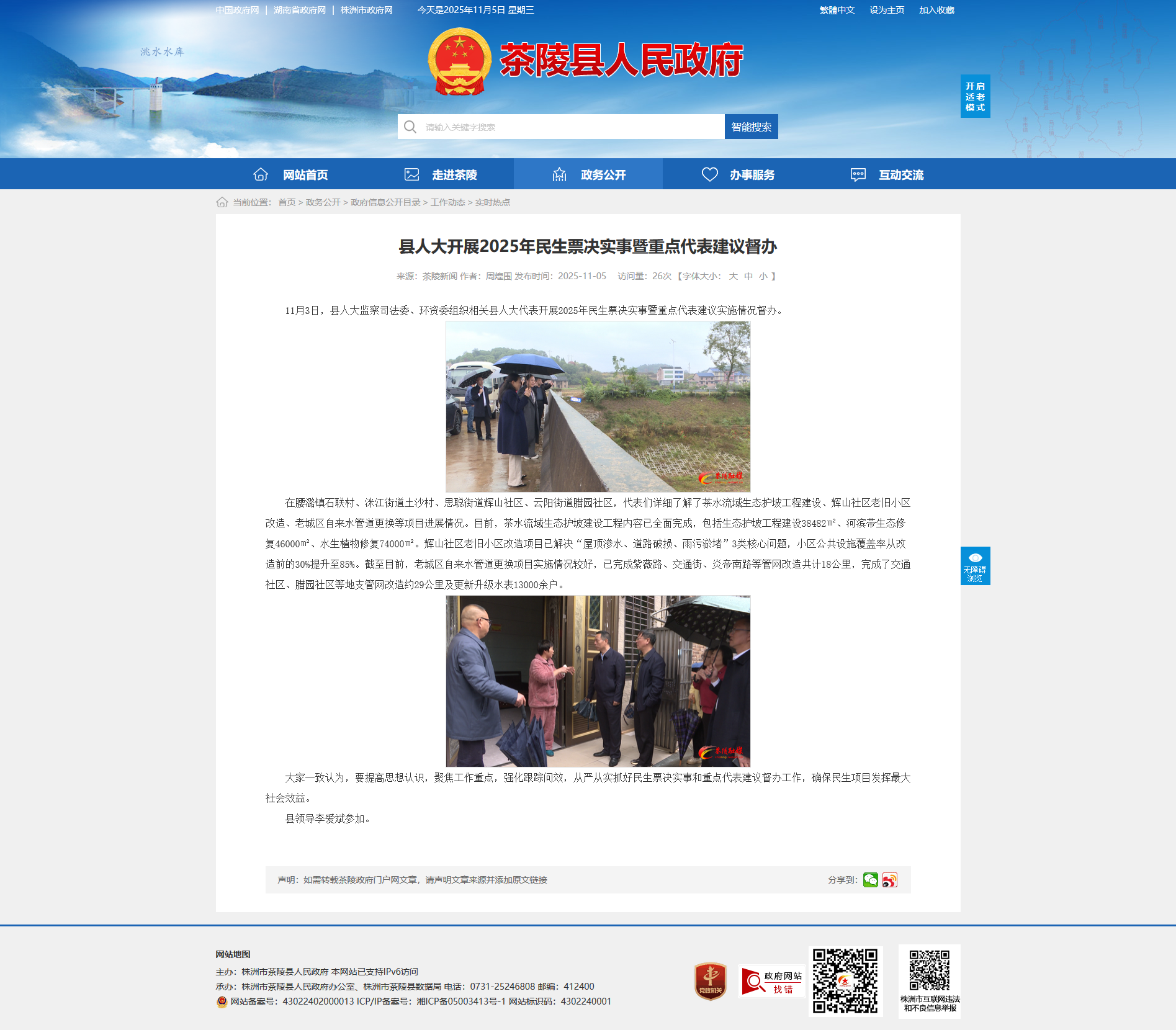 在腰潞镇石联村、洣江街道土沙村、思聪街道辉山社区、云阳街道腊园社区,代表们详细了解了茶水流域生态护坡工程建设、辉山社区老旧小区改造、老城区自来水管道更换等项目进展情况。目前,茶水流域生态护坡建设工程内容已全面完成,包括生态护坡工程建设38482㎡、河滨带生态修复46000㎡、水生植物修复74000㎡。辉山社区老旧小区改造项目已解决“屋顶渗水、道路破损、雨污淤堵”3类核心问题,小区公共设施覆盖率从改造前的30%提升至85%。截至目前,老城区自来水管道更换项目实施情况较好,已完成紫薇路、交通街、炎帝南路等管网改造共计18公里,完成了交通社区、腊园社区等地支管网改造约29公里及更新升级水表13000余户。