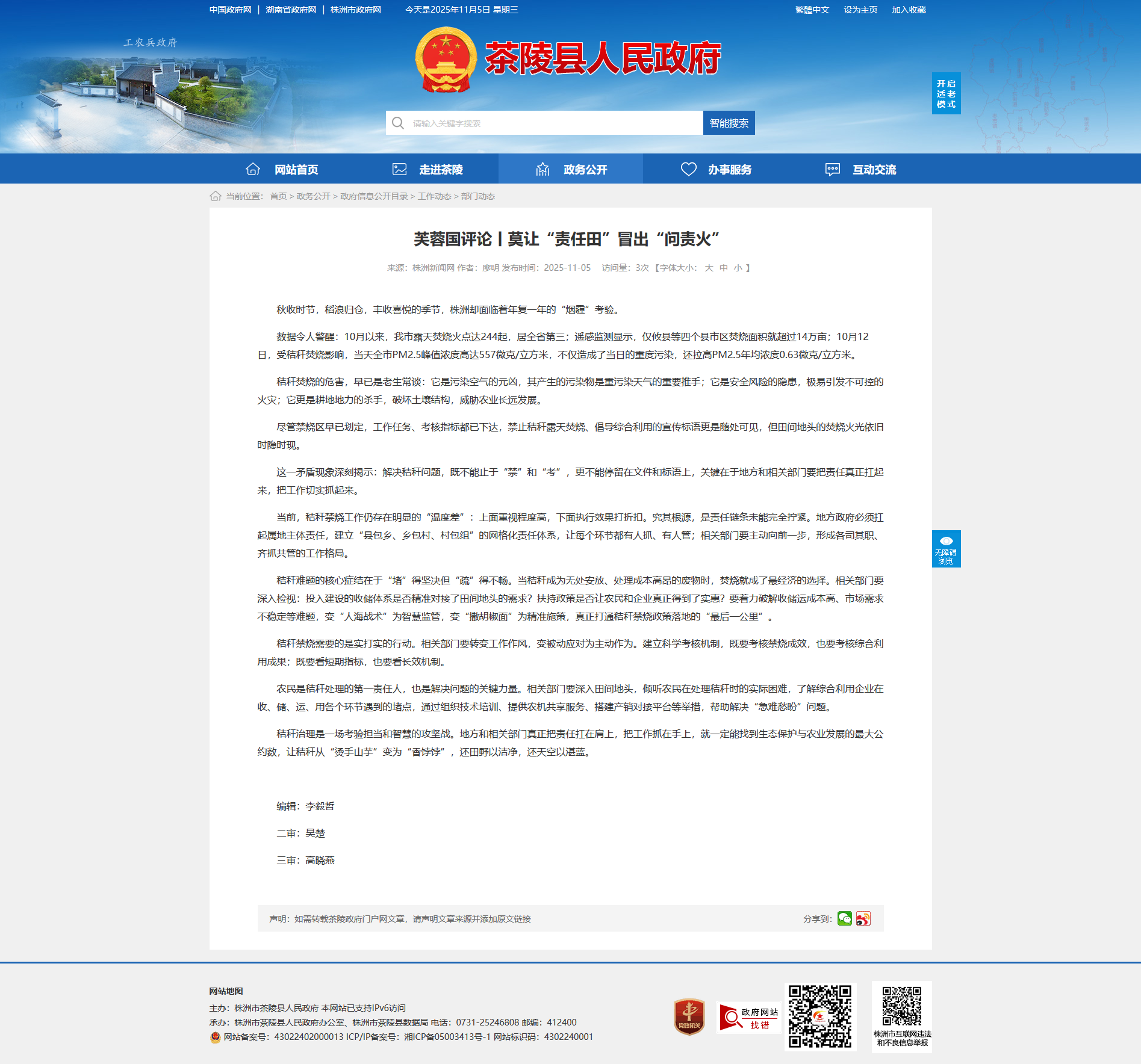 当前,秸秆禁烧工作仍存在明显的“温度差”:上面重视程度高,下面执行效果打折扣。究其根源,是责任链条未能完全拧紧。地方政府必须扛起属地主体责任,建立“县包乡、乡包村、村包组”的网格化责任体系,让每个环节都有人抓、有人管;相关部门要主动向前一步,形成各司其职、齐抓共管的工作格局。
