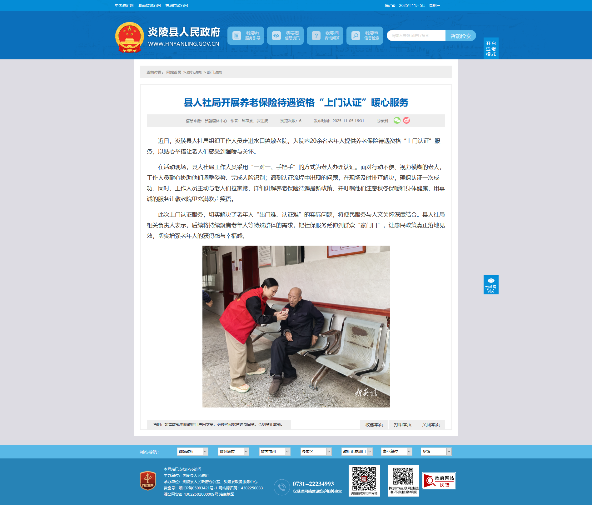 近日,炎陵县人社局组织工作人员走进水口镇敬老院,为院内20余名老年人提供养老保险待遇资格“上门认证”服务,以贴心举措让老人们感受到温暖与关怀。