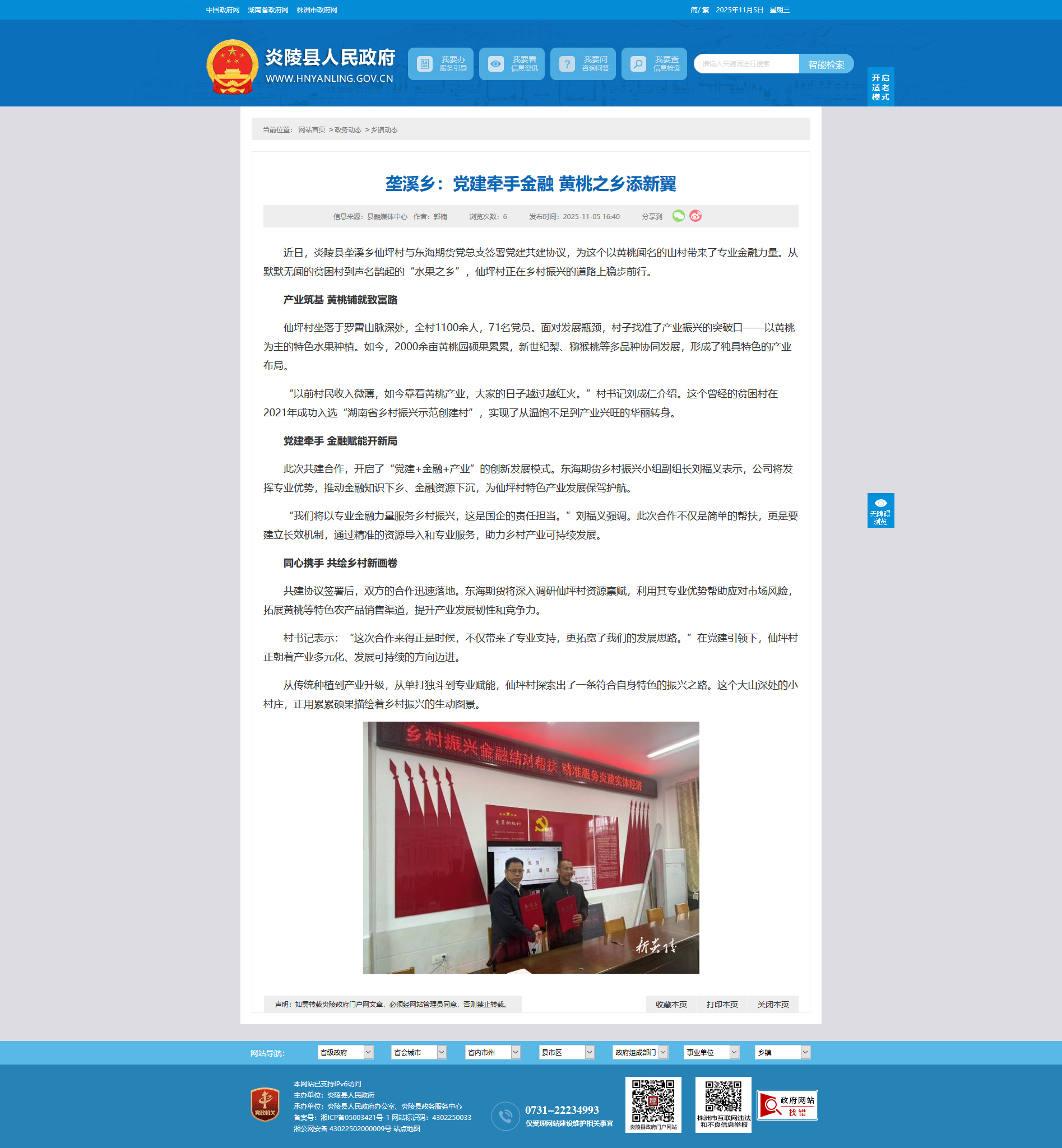 近日,炎陵县垄溪乡仙坪村与东海期货党总支签署党建共建协议,为这个以黄桃闻名的山村带来了专业金融力量。从默默无闻的贫困村到声名鹊起的“水果之乡”,仙坪村正在乡村振兴的道路上稳步前行。