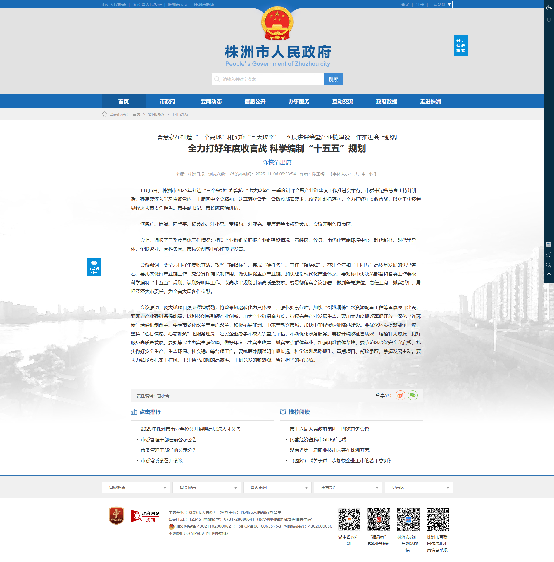 会议强调,要大抓项目强支撑增后劲,将政策机遇转化为具体项目,强化要素保障,加快“引洮润株”水资源配置工程等重点项目建设。要聚力产业强链条提能级,以科技创新引领产业创新,加大产业链招商力度,持续完善产业发展生态。要加大力度抓改革促开放,深化“连环债”清偿机制改革、要素市场化改革等重点改革,积极拓展非洲、中东等新兴市场,加快中非经贸株洲陆港建设。要优化环境提效能争一流,坚持“心甘情愿、心急如焚”的服务理念,落实企业办事不求人等重点举措,不断优化政务服务。要提升税收征管质效,培植壮大财源,更好服务高质量发展。要聚焦民生办实事强保障,做好年度民生实事收尾,抓实重点群体就业,加强困难群体帮扶。要防范风险保安全守底线,扎实做好安全生产、生态环保、社会稳定等各项工作。要统筹兼顾谋明年抓长远,科学谋划思路抓手、重点项目、衔接争取,掌握发展主动。要大力弘扬真抓实干作风,干出快马加鞭的高效率、千帆竞发的新热潮、笃行担当的好形象。
