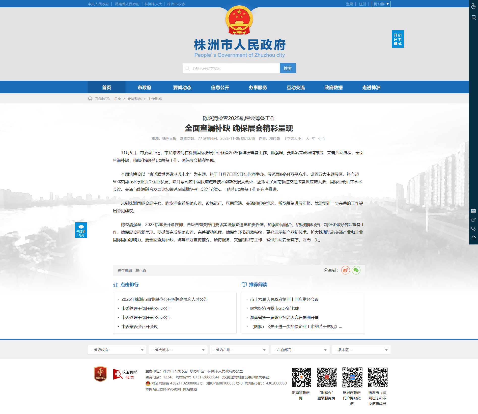 陈恢清强调,2025轨博会开幕在即,各级各有关部门要切实增强紧迫感和责任感,加强协同配合,积极履职尽责,精细化做好各项筹备工作,确保展会精彩呈现。要抓紧完成场馆布置,完善活动流程,确保各环节高效衔接,更好展示新产品新技术,扩大株洲轨道交通产业和企业国际国内影响力。要全面查漏补缺,统筹抓好宣传推介、接待服务、交通组织等工作,确保活动安全有序、万无一失。